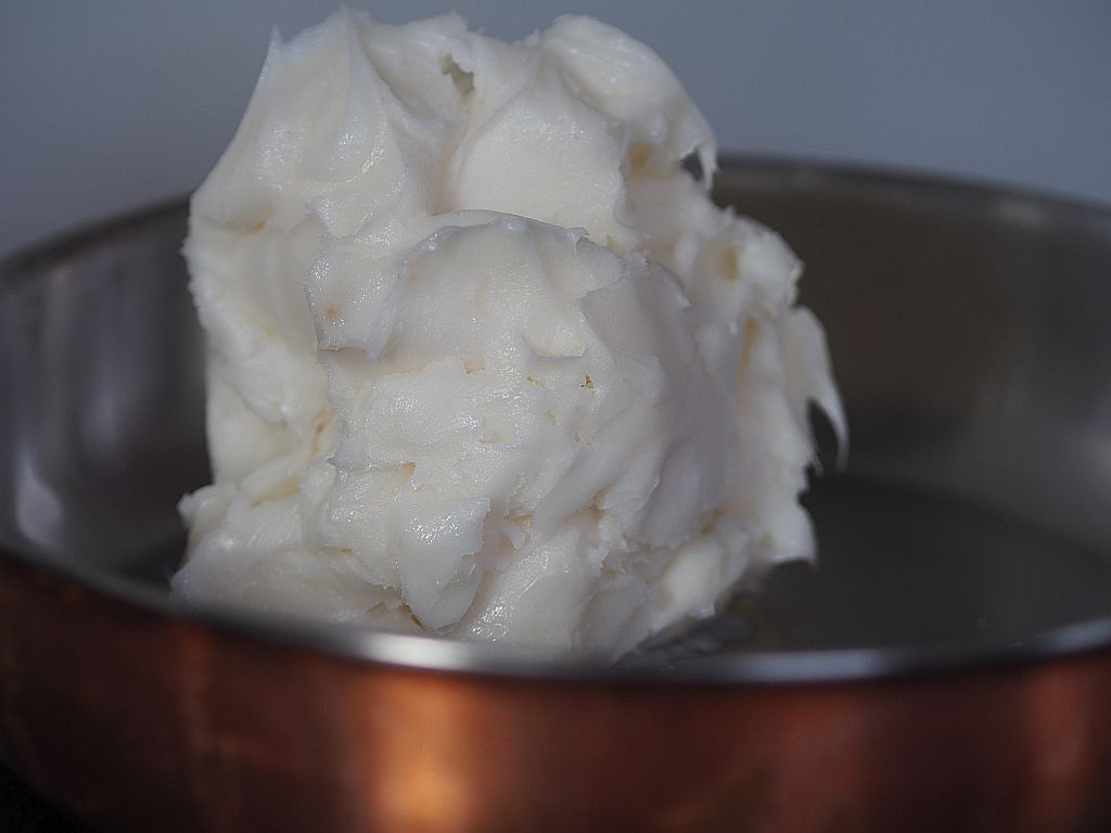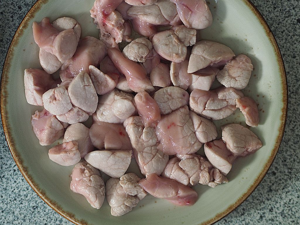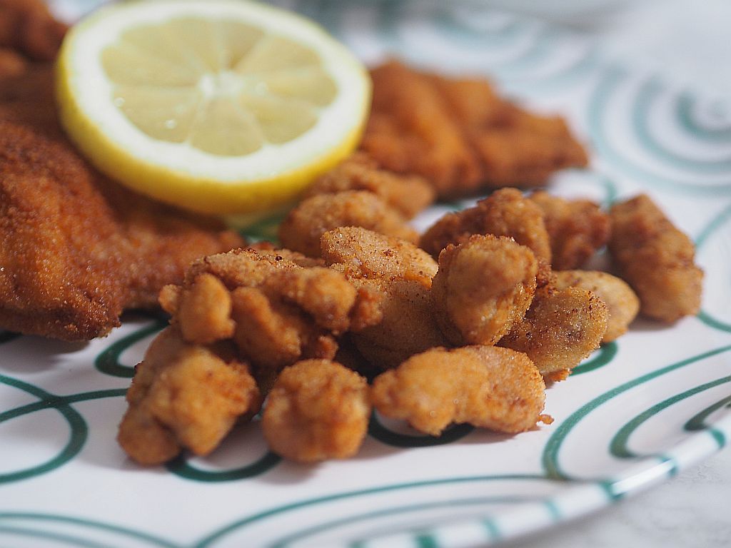 Bei Fr. Ringl haben wir auch ein Kalbsbries besorgt, denn das wird im Kochbuch weiters angeführt, das gebackene Kalbsbries. Mittlerweile etwas aus der Mode geraten, aber Millionen früherer Generationen haben auf das gebackene Kalbsbries geschworen, so auch der Vater von Fr. Ringl, sowie der Großvater. Das Kalbsbries ist extra zart, man kann es in die einzelnen Rosen zerpflücken oder unzerteilt wie Schnitzeln herausbacken. Wir haben es in Rosen zerteilt wie bei Hedi Klinger, das sieht dann so aus wie gebackene Pilze. (Und übrigens: es schmeckt fantastisch!) Bei Hedi Klinger steht, man müsse das Kalbsbries putzen, grobe Häute entfernen sowie Blutgerinnsel, das ist freilich nicht jedermanns Sache, für uns hat das dankenswerter Weise Fr. Ringl erledigt. Nach dem Blanchieren wurden von der Küchenfee die letzten Reste entfernt.