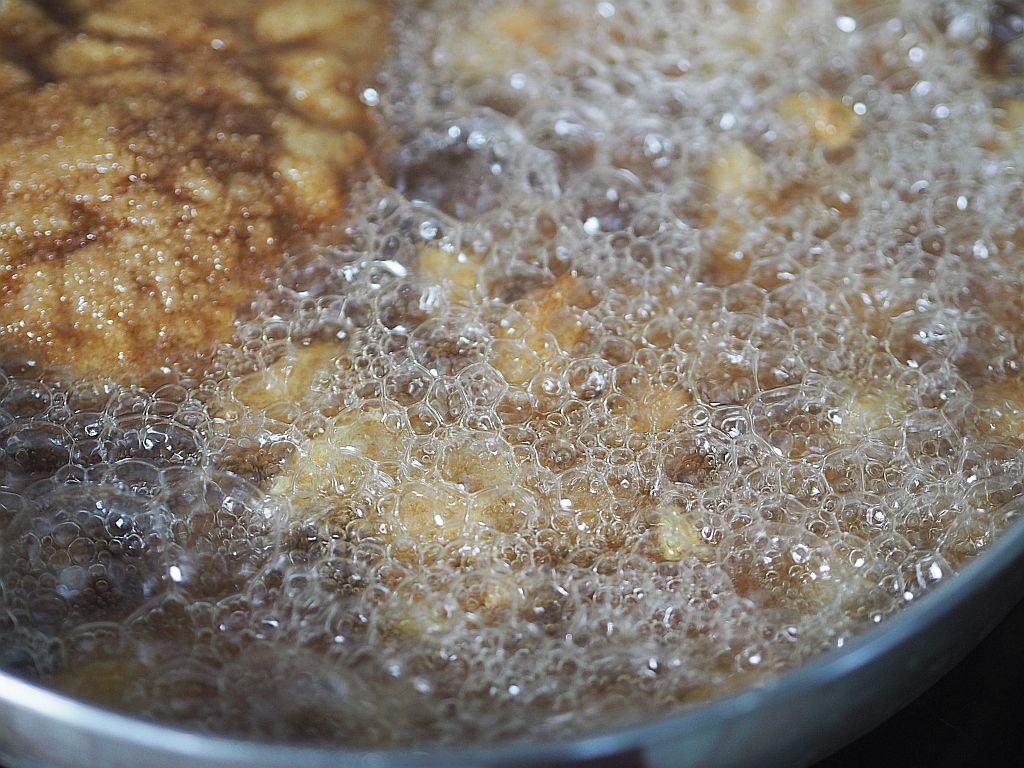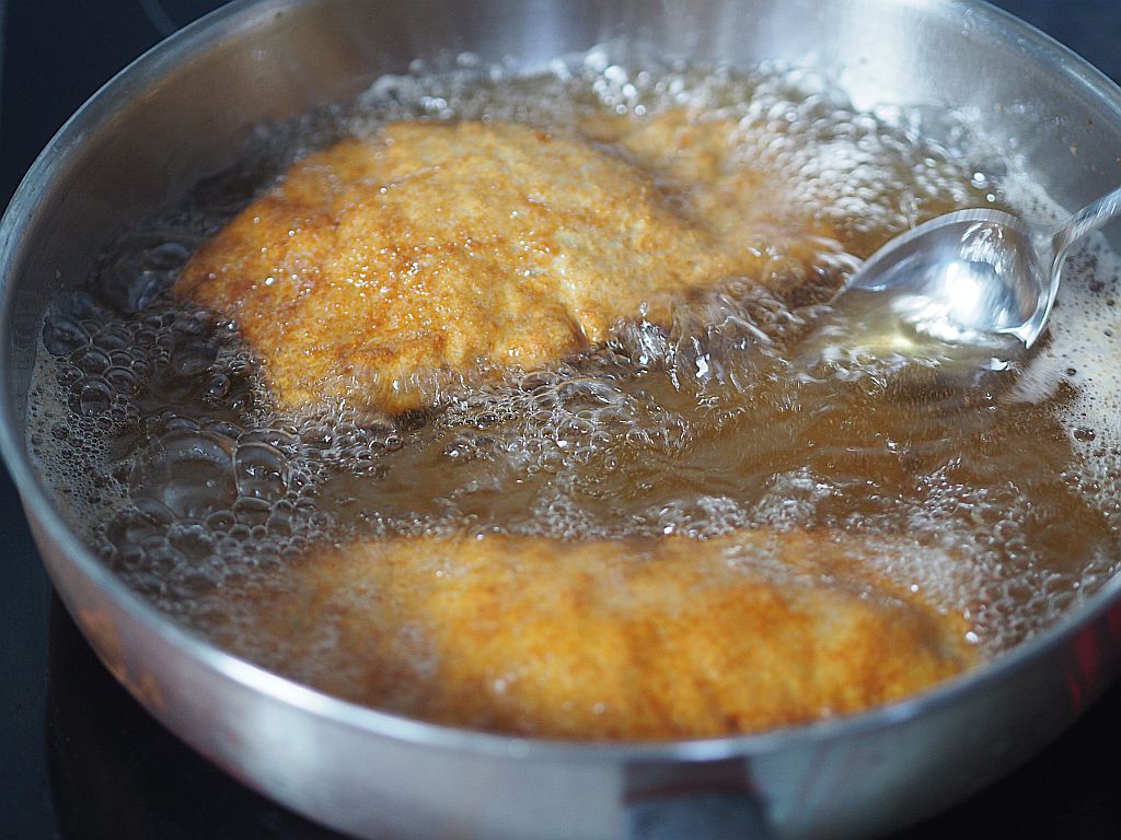 Das heißt also, wenn man sicher gehen kann, daß es die richtige Temperatur hat, sollte das Fett beim Einlegen der Schnitzel nicht so spritzen. Wir haben genau diesen Tip ausprobiert. Und ich kann es gleich sagen, Feuerlöscher haben wir keinen gebraucht, obwohl es schon einiges an Mut kostet, es darauf ankommen zu lassen. In unserer heutigen Zeit greift man nicht mehr zurück auf die in Jahrzehnten gewonnenen Erfahrungswerte, aber genau die wären verläßlich, haben Hand und Fuß.