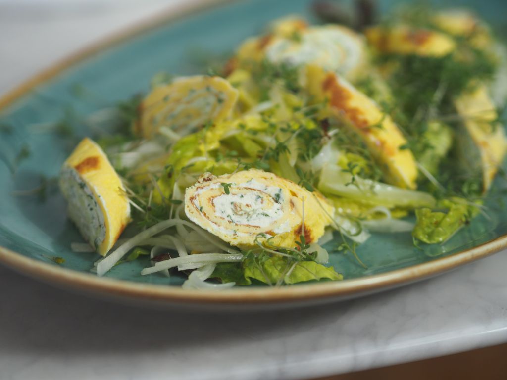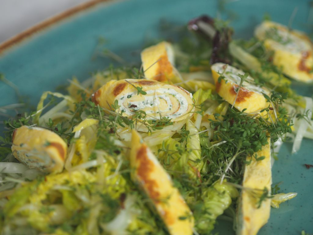 Kohlrabi-Salat in Scheiben und dann in Streifen schneiden. Salatherzen in Streifen schneiden. Mit einer Vinaigrette aus Apfelessig, Olivenöl und Salz. Omeletteschnecken: Dotter mit Frischkäse cremig rühren. Dann das Eiweiß dazu und rühren, nicht aufschlagen; dadurch wird das Omelette fluffig! Die Omelettes mit Frischkäse füllen.