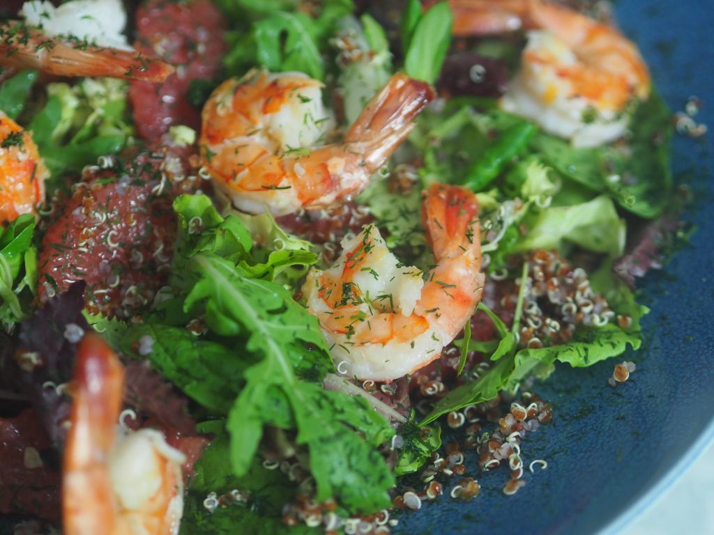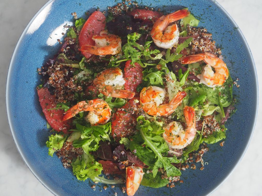 Garnelen-Salat Roten Quinoa bißfest kochen, abtropfen lassen, Grapefruit filetieren, Saft auffangen, Saft einköcheln, mit Olivenöl und Salz vermischen. Babyleaf-Salat, Grapefruit und Quinoa miteinander vermischen. Dille drauf, Dressing und die gegrillten Garnelen.