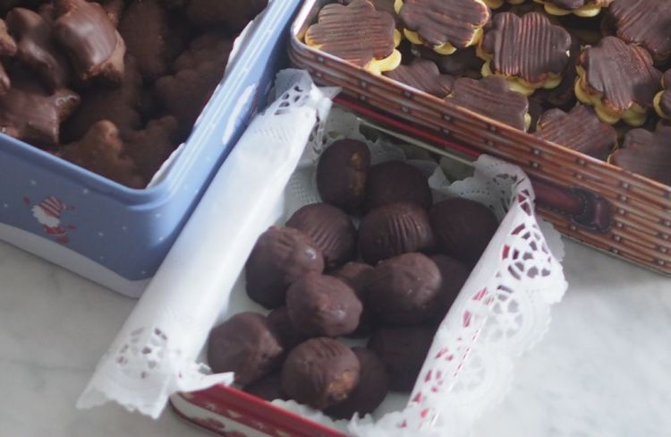 Vegane Pfeffernüsse 200g Walnußkerne o.H. mit 40g goldenem Leinsamen im Standrührgerät fein mahlen. In eine Schüssel geben, 70g Buchweizenmehl, 1EL Lebkuchengewürz, 40g Kokosmehl, 150 Dattelpaste verrühren. 20 Min. ruhen lassen. In dieser Zeit quellt der Leinsamen und bindet. Kugeln formen.in die halbkugelige Form drücken und mit 60 % Schokolade bepinseln.
