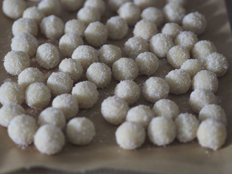Vegane Schneekugeln 60 g Kokosnuß und 60 g Kokosöl erwärmen im Wasserbad. Einen Viertelliter Kokosmilch aufkochen, 70g Xylit hineingeben und eine halbe Packung Vanillepudding. Sofort vom Herd nehmen und ständig rühren, bis man einen Vanillepudding hat. 250g Kokosmehl mit 50 g Kokosraspel vermischen. Den Vanillepudding hineinrühren. Die Kokosmischung gut durchrühren und kaltstellen. Kugeln formen und in Kokosraspeln wälzen.