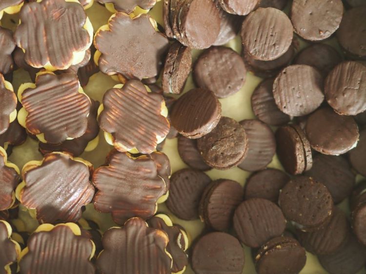 Unsereoreokekse: Buchweizenmehl, weiße Mandeln, Kakaopulver, Ahornsirup, Kokosöl, Shea-Butter, Xylit, Orangenöl, dunkle Schokolade, Salz.