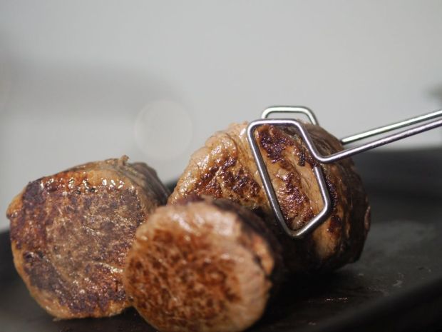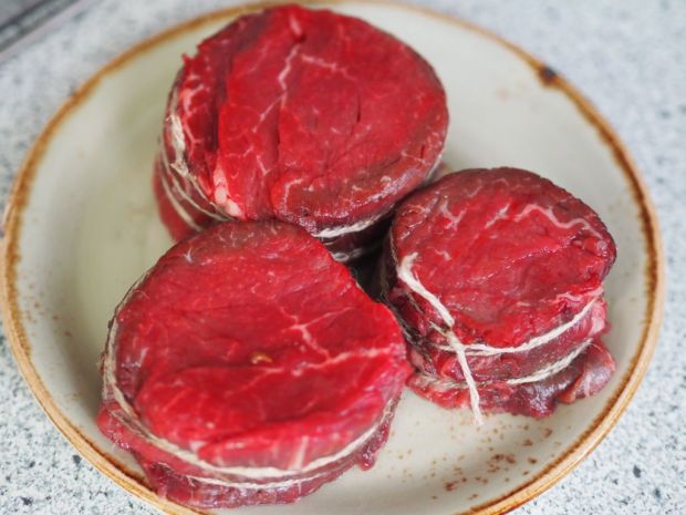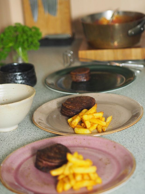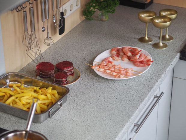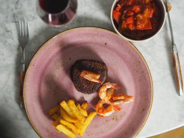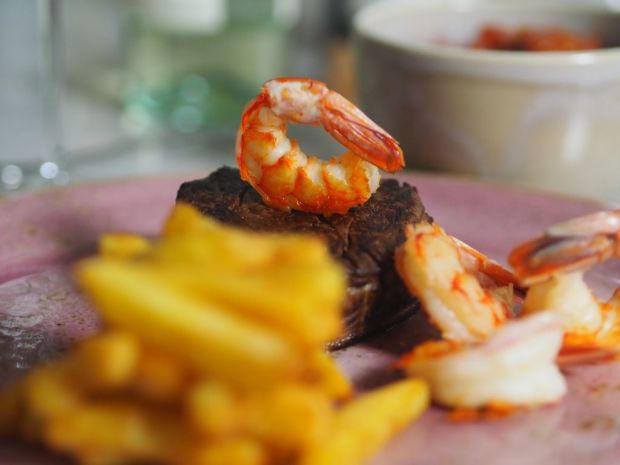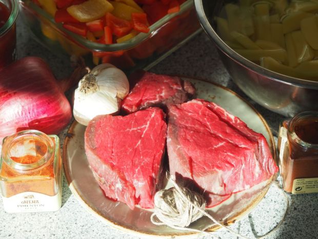 Feinster, gut abgehangener Rindslungenbraten (Roastbeef) mit Letscho und selbst gemachten Pommes frites. Wir haben ihn gesurft, das heißt mit Garnelen versehen. Davor gab es eine Suppe, die wurde ebenso gesurft; und außerdem: auch hier haben sich Paprika eingeschlichen, wie beim Rindslungenbraten, Stichwort: Letscho. Die Lungenbratenstücke haben wir am gleichen Tag besorgt, also heute Donnerstag. Zeitig in der Früh noch vor 7 Uhr waren wir schon in der Fleischerei Ringl. Ich muss sagen, sehr gemütlich, so früh sollte man das öfters machen. Außerdem haben wir Küchengarn für die Steaks abgebettelt. Das Letscho wird in einer Schüssel getrennt vom Steak serviert, damit es keine Teller-Überschwemmung gibt, ein echter Monk halt. Letscho kann man zu allem essen, zu Steak oder Würstel, das macht keinen Unterschied. Das wußten schon die alten Ungarn. Zum Schluß gingen uns die Pommes frites aus, so kamen wir zu einem Pommes-frites-Vergleich. Welche schmecken besser: Die selbst gemachten oder die gekauften TK-Fritzen? Naja, das ist ja keine Frage. Obwohl, wenn gekaufte Pommes dann 11er.