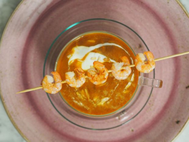 4 Paprika entkernen, im Backrohr mit der Grillfunktion die Haut schwarz werden lassen, herausnehmen und die Haut abziehen. Zwei Stangen Sellerie hacken, in wenig Olivenöl mit einer fein gehackten Zwiebel in einem Topf kurz anschwitzen. Die gegrillten Paprika dazu geben. Und eine Viertelstunde köcheln lassen. In den Standmixer geben. Einen Esslöffel gehackte Mandeln dazu geben und pürieren. Zurück in den Topf, mit Salz abschmecken. Die Garnelen auf Holz spießen. Kurz vor dem Servieren auf der Grillplatte beidseitig anbraten, die Suppe mit einem Klecks Joghurt und den Garnelen servieren.