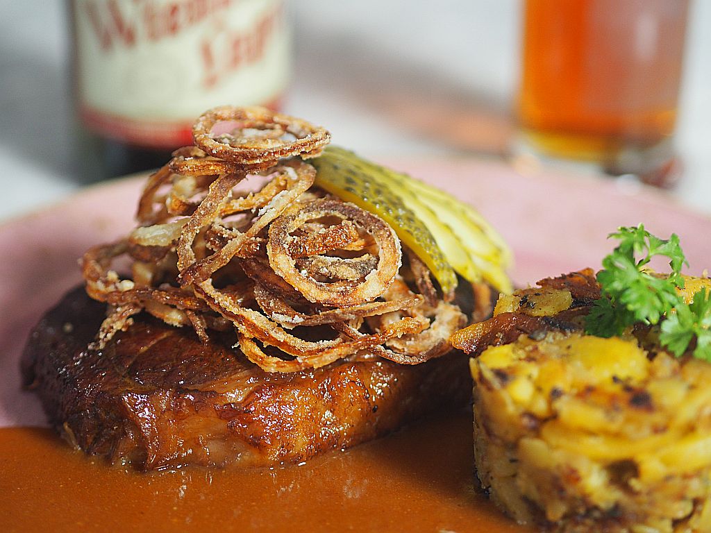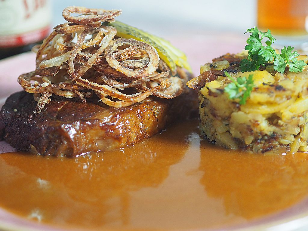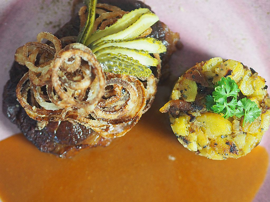 Gehackte Zwiebel, gewürfeltes Suppengrün in Olivenöl in der Bratpfanne anbraten und mit Gemüsebrühe aufgießen. Lorbeerblatt, Pfefferkörner dazugeben. Parallel in der Bratpfanne das Schulterscherzel auf allen Seiten anbraten. Das Fleisch in die Bratreine legen zum Gemüse, die Bratpfanne mit Gemüsefond ablöschen und auch in die Bratreine gießen. 2 Stunden bei 160 Grad im Backrohr schmoren. In der Zwischenzeit Erdäpfel in der Schale weichkochen. Schälen. In dünne Scheiben schneiden. Fein gehackte Zwiebel in Olivenöl anschwitzen. Die Kartoffelscheiben dazu geben, mit Salz, Kümmel und Majoran abschmecken und anrösten. Zwiebel in dünne Ringe schneiden. Kurz in Mehl wenden. In heißem Öl goldbraun frittieren. Auf Küchenkrepp abtropfen lassen. Das Fleisch aus der Bratreine herausheben und warm stellen. Die Sauce durch ein Sieb abgießen. Mit Senf abschmecken und mit Kartoffelstärke binden. Anrichten Fleisch aufschneiden, Röstzwiebel daraufgeben und den Erdäpfelschmarren und die Sauce auf den Teller geben. Mit aufgeschnittenen Essiggurkerln servieren.
