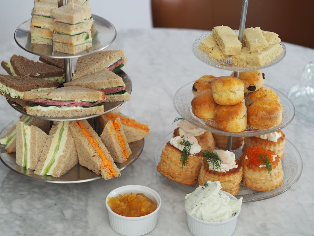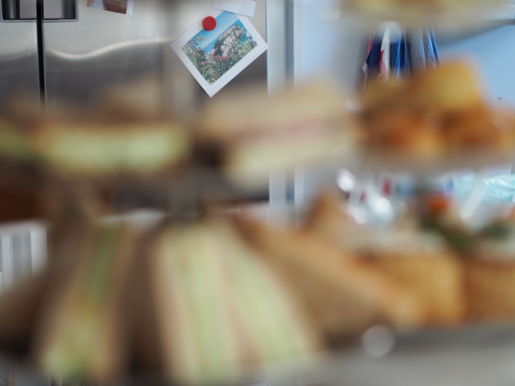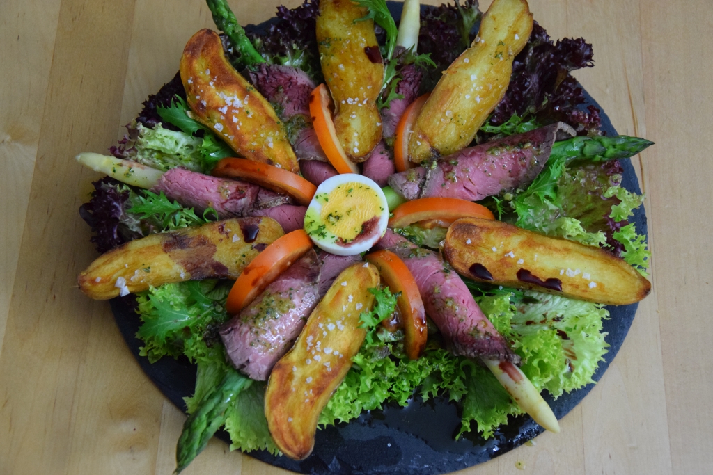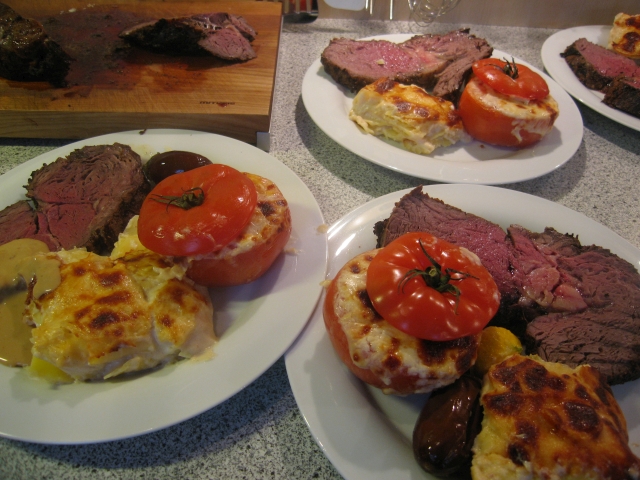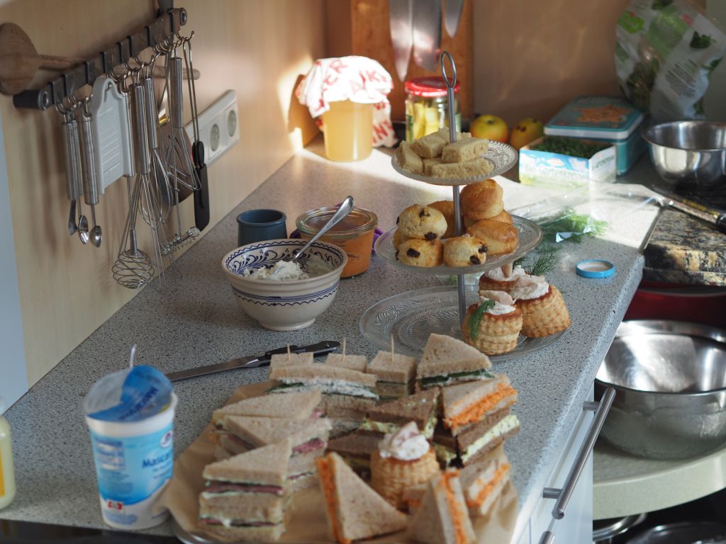 Statt Tomaten sollten Ribisel sein, diese hätte es gegeben, haben wir aber verweigert, kamen aus Holland, sehr teuer. Statt Blattsalatherzen aus Spanien, nahmen wir Wildkräuter aus dem Glashaus. Ziegenbutter statt „normaler“ Butter, englischer Senf, Cottage Cheese, Roastbeef, Avocado waren ziemlich hart, Tomaten, Kresse, rote Senfsprossen, Wildkräutersalat mit Pimpinelle, Schafgarbe und Sauerampfer.