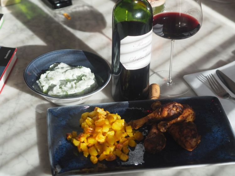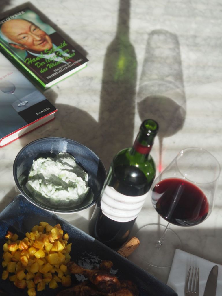 Hühnerherzen mit Polenta und einer Balsamicosoße. Dazu braucht es einen kräftigen Wein als Gegenpol: Domaine de Cambes, Bordeaux, 2020, Familie Mitjavile. Das Anbaugebiet dieses Weines liegt gleich neben dem des Roc de Cames, aber eben schon jenseits der Grenze der Côtes de Bourg, einem der klassischen Weinbaugebiete des Bordeaux, und ist damit bedeutend erschwinglicher als der Roc de Cambes. Er erfüllt somit den Wunsch vieler Weintrinker nach einem guten Wein zu einem vernünftigen Preis.