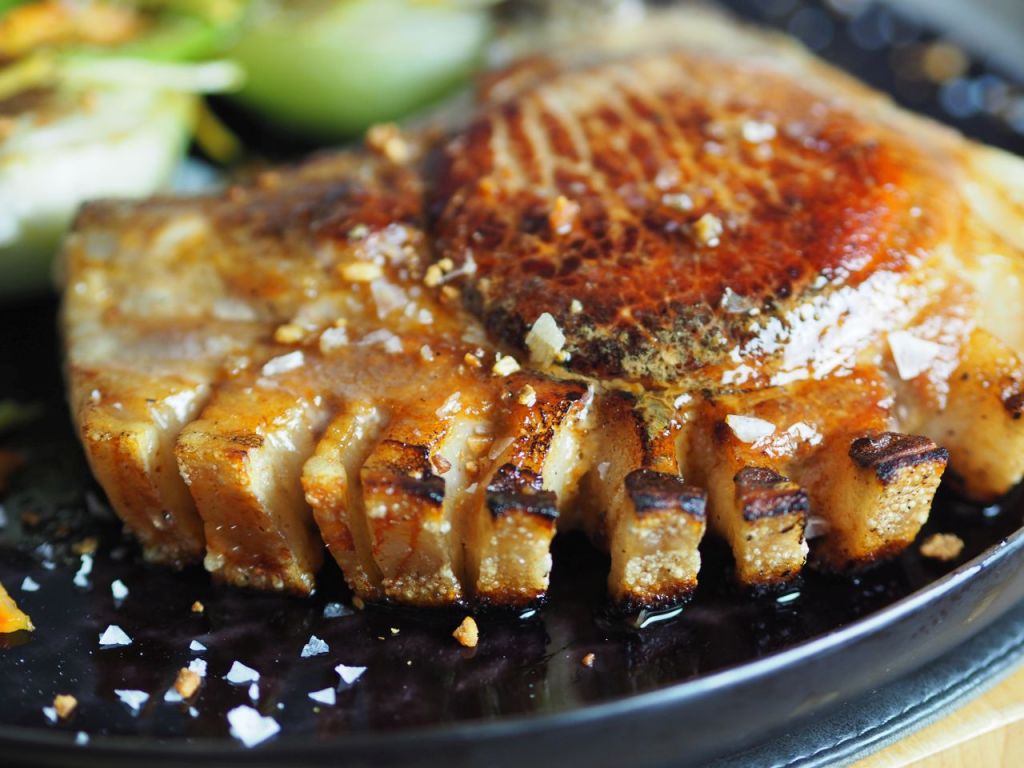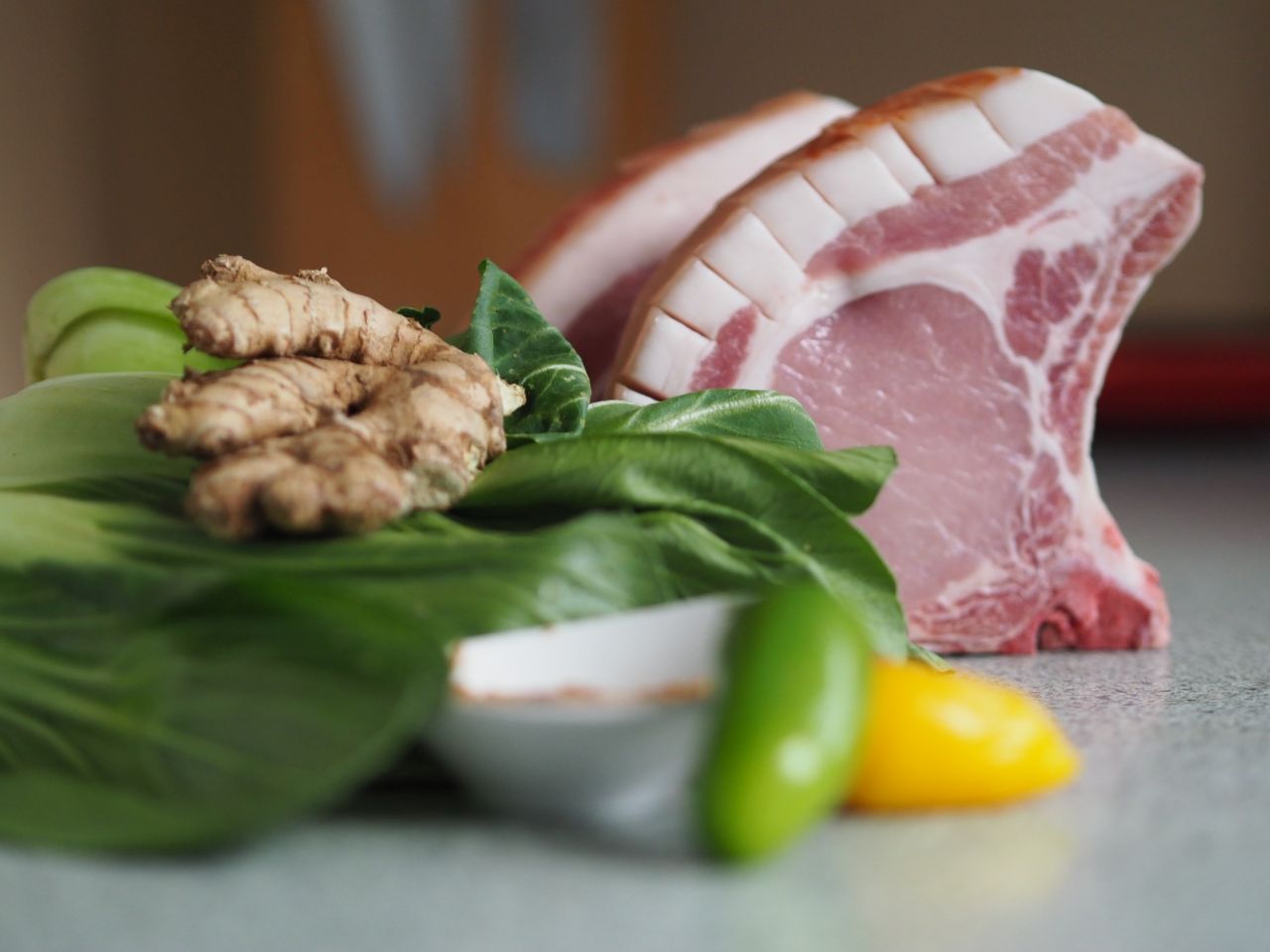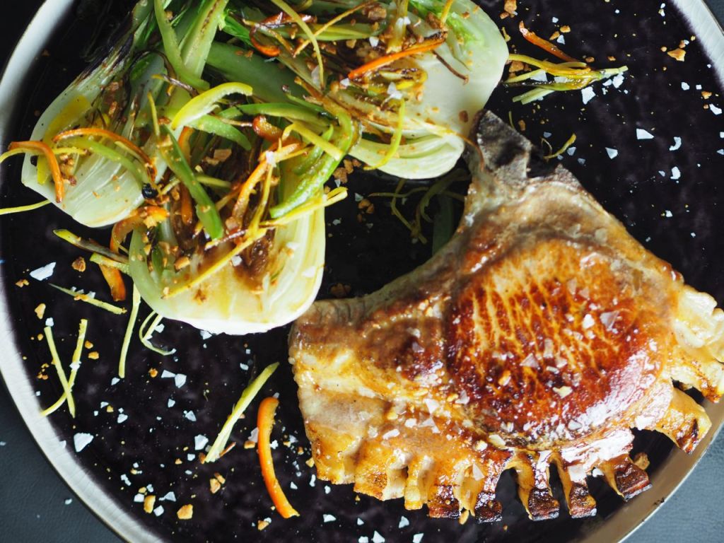 Mit asiatischem Einschlag: Chili und Ingwer. Das geschröpfte Schweinskotelett in der Pfanne beidseitig anbraten. Im Ofen bei 100 Grad fertig durchgaren. In der Zwischenzeit Chili in dünne Streifen schneiden, den geschälten Ingwer ebenso in feine Streifen schneiden, Pak Choi halbieren. Pak Choi in der Pfanne beidseitig anbraten. Die Chilis und den Ingwer dazu geben, kurz mitbraten. Auf den Teller legen und das Kotelett dazu. Mit frittiertem Knoblauch bestreuen.