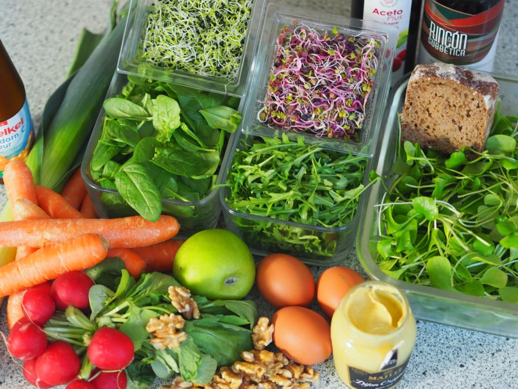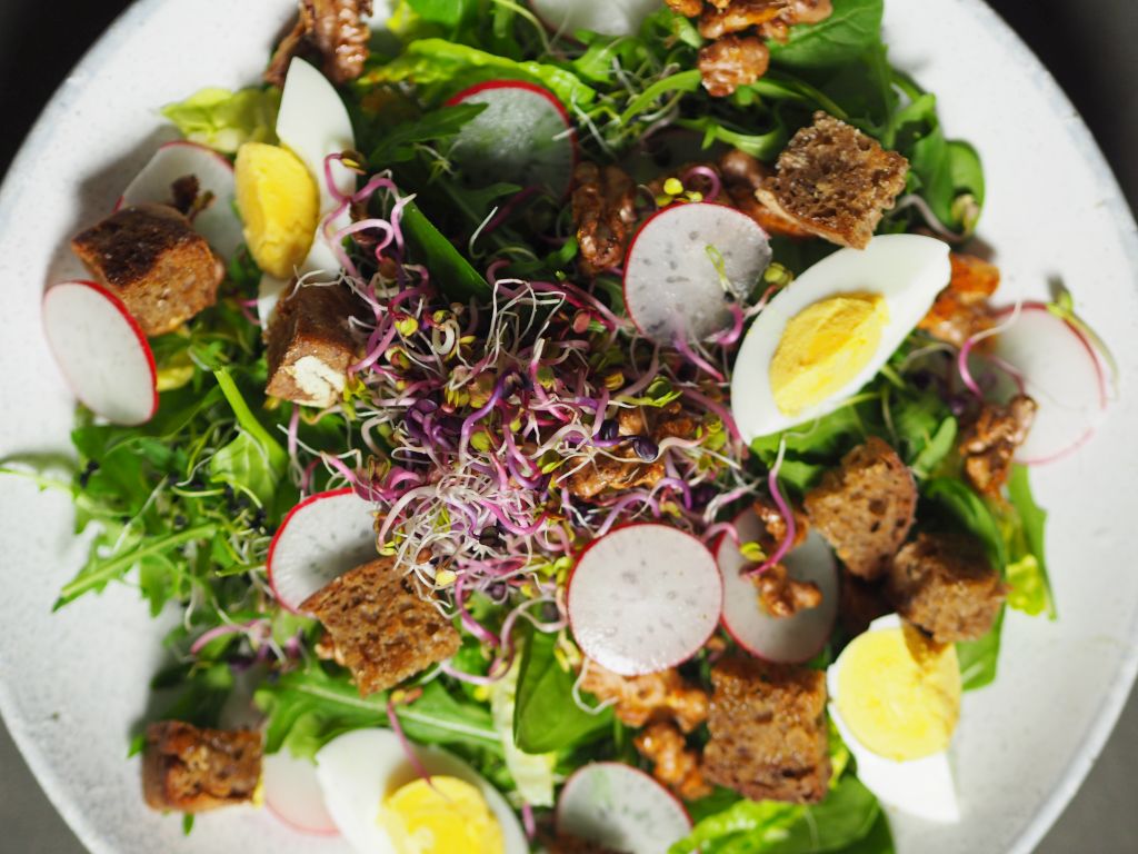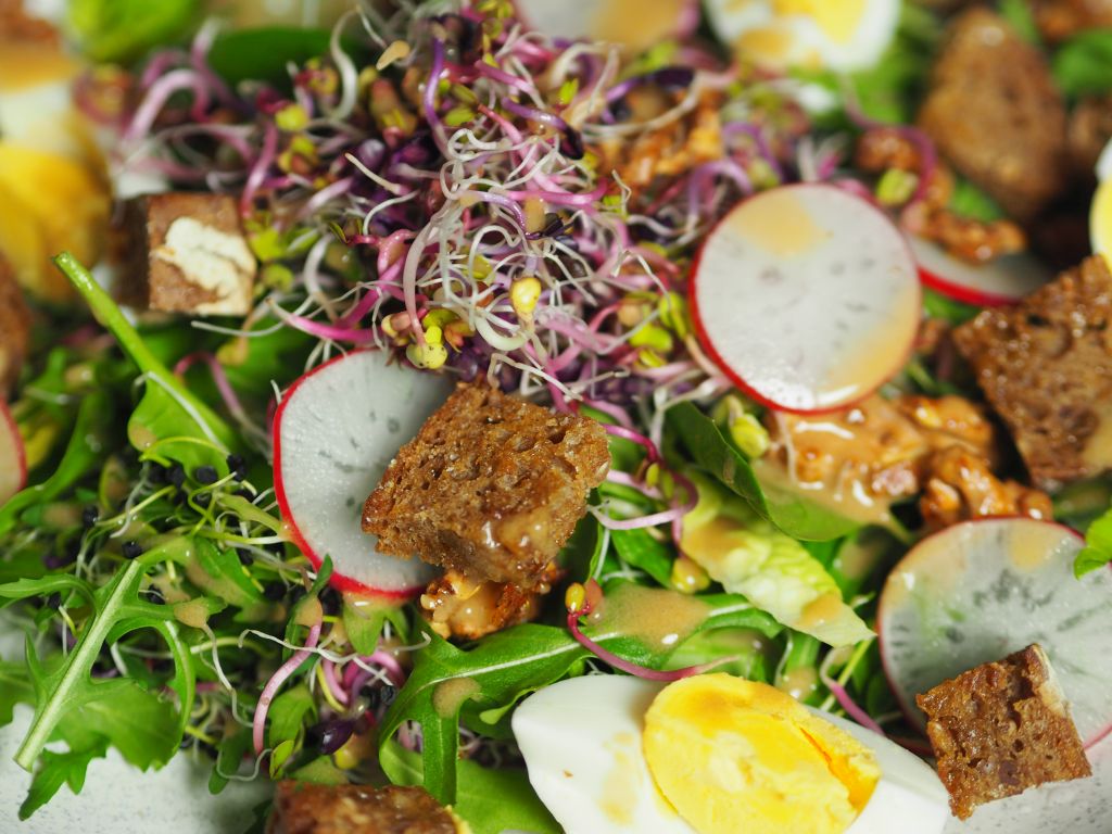 Ein Handvoll Baby-Spinat, eine Handvoll Rucola, ein Handvoll Portulak, eine Tasse Radieschen, eine tasse mit Radieschen-Sprossen miteinander vermischen. Die Radieschen in dünne Scheiben schneiden, eine Viertelstunde in eiskaltes Wasser legen. Abgießen und unter den Salat mischen. Die Walnüsse grob hacken und auf einem mit Backpapier belegtem Backblech legen. Mit wenig Honig beträufeln. Im Backrohr kurz karamellisieren. Roggenbrot in Würfel schneiden und in der Pfanne kurz anrösten. Zwei Eier hart kochen. Die Marinade: Olivenöl, Apfelessig und Dijon-Senf und Salz verrühren. Den Salat anrichten. Die karamellisierten Walnüsse, die Brotwürfel, das in Scheiben geschnittene Ei darauf platzieren und mit der Marinade beträufeln.