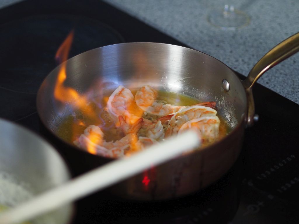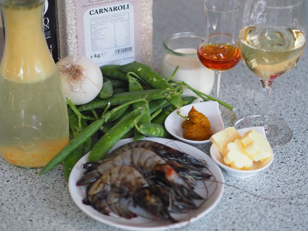 Garnelen in Currysauce Erbsenschoten schälen, sodass sich etwa 25 Gramm Erbsen ergeben. Zwei Garnelen in Stücke schneiden und weitere sechs Garnelen im Ganzen in einer Pfanne mit zerlassener Butter garen, bis sie rötlich schimmern. Einen kräftigen Schluck Cognac dazu geben und flambieren. Die Currypaste, Sahne und Erbsen dazu geben und verrühren. Mit Salz und weißem Pfeffer verfeinern und fünf Minuten köcheln lassen. Die ganzen Garnelen herausholen und auf die Seite legen. Risotto Fein gehackten Zwiebel in Olivenöl anschmelzen, den Carnarolireis dau geben und mitdünsten. Mit einem Achterl Weißwein angießen und einköcheln lassen. Dann mit einem halben Liter heißer Gemüsebrühe nach und nach angießen, unter ständigem Rühren. Die Garnelen-Curry-Sauce dazu gießen, verrühren. Anrichten Den Risotto in die Teller geben und die ganzen Garnelen darauflegen.