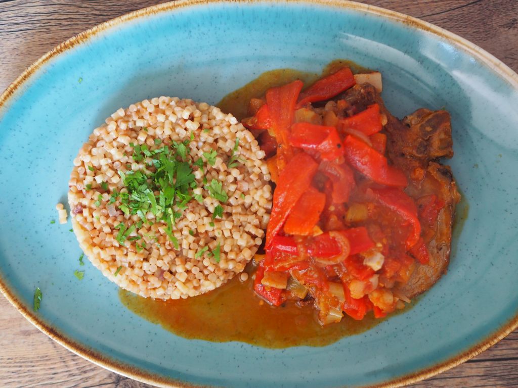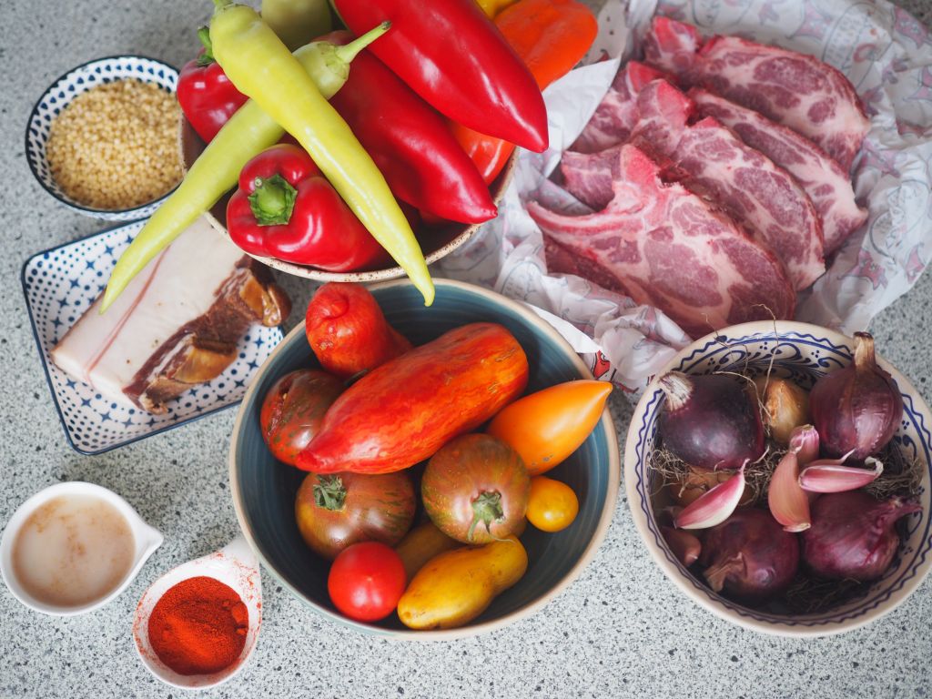 Zwei Eßlöffel klein gewürfelten Mangalitzaspeck in einer Sauteuse auslassen. Den kleinen, in Scheiben geschnittene violette Zwiebel dazu geben und auf mittlerer Hitze langsam anschwitzen lassen. Fünf rote Paprika frisch aus dem Burgenland und zwei grüne, schön scharfe Pfefferoni, ebenso frisch aus dem Burgenland, in Stücke schneiden. Von sechs größeren Stekovics-Paradeisern die Haut abziehen und würfeln. Paprika und Tomaten zu den Zwiebeln geben. Ein Eßlöffel Paprikapulver und zwei geriebene Knoblauchzehen von Stekovics dazu geben und auf mittlerer Hitze köcheln lassen, etwa eine halbe Stunde lang. Vier Scheiben vom Schweinsschopf marinieren. Dazu ein ausgelassenes Schweineschmalz mit Salz und gepresstem Knoblauch zusammen rühren. Beidseitig scharf anbraten und zum Schluß für zirka zehn Minuten in das Letscho legen. Die Tarhonya: eine fein gehackte kleine Zwiebel und einen Teelöffel klein gewürfelten Mangalitzaspeck in der Pfanne kurz anschwitzen. Die Tarhonya dazu geben und bei mittlerer Hitze goldbraun braten. Mit Wasser aufgießen, salzen und weichkochen. Anrichten.