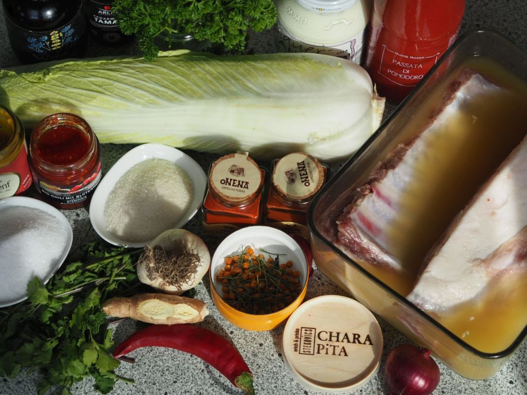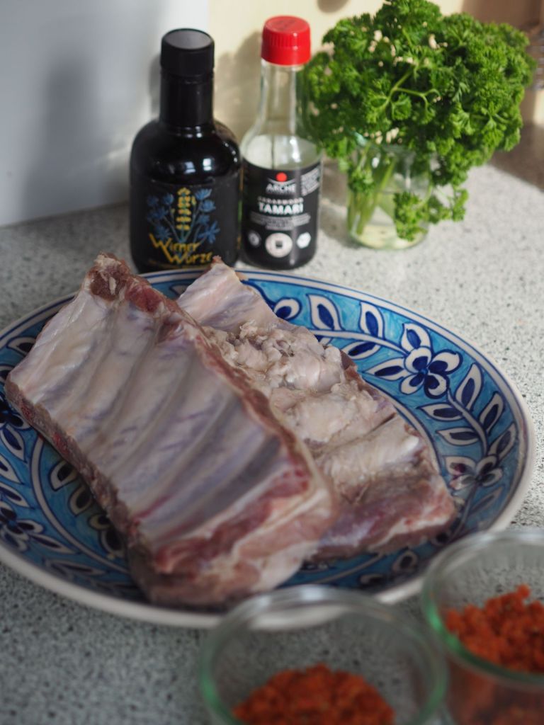 Eigentlich hatten wir vor, den Chinakohlsalat nach Alexander Herrmann zu machen, das ist sich aber nicht ausgegangen. Danach kamen wir auf die Schweinsripperl, die wir in der Fleischerei Ringl gesehen hatten. Und so kam es zu dieser außergewöhnlichen Kombination Schweinsripperl mit Jägersalat, grad richtig zum Nationalfeiertag. Bei uns sagt man Jägersalat zum Chinakohl.