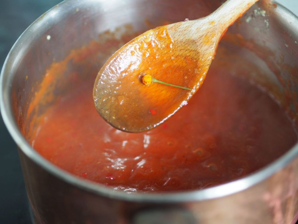 Irgendwie haben wir uns bei der Schärfe vertan: eigentlich hätte die Sauce scharf werden sollen und der Salat nicht. Herausgekommen ist es umgekehrt. So wurde die Sauce zum Ablöschen verwendet! Vielleicht liegt es auch daran, daß wir zum ersten Mal Chara Pita verwendet haben. Das ist ein Pfeffer, der wild wächst in den Anden, aber gezähmt von Stekovics nun im Burgenland wächst.