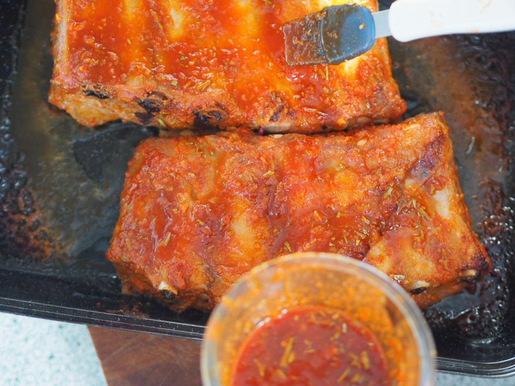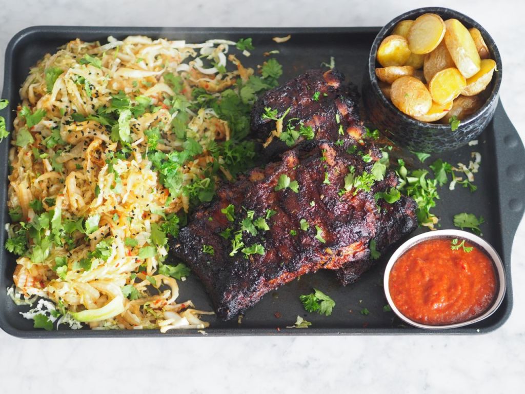Schweinsripperl Die Ripperl von Ringl 24 Stunden marinieren, in Ananassaft legen. Abgießen in eine Kasserolle und einköcheln auf ein Viertel. Salz brauner Zucker geräuchertes scharfes und süßes Paprikapulver Knoblauchzehen getrockneter Rosmarin und Chara Pita im Mixstandgerät pürieren mit dem Ananassaft verrühren Fleisch mit dieser Marinade bepinseln und bei 140 Grad drei Stunden lang im Backrohr braten. Alle halbe Stunden herausnehmen und mit der Marinade bepinseln. Grillsauce eine feingehackte Zwiebel und drei feingehackte Knoblauchzehen in Butter fein anschwitzen eine süße Chilischote klein hacken dazu geben ein Stück Ingwer dazureiben mit einem Teelöffel braunem Zucker bestreuen kurz karamellisieren lassen und zwei Eßlöffel Apfelessig dazu gießen einköcheln verdampfen lassen. 300 Milliliter Tomatensauce einen Teelöffel Senf ein Eßlöffel Ahornsirup und nach Geschmack Wiener Gewürz (Genußkoarl) plus eine zerdrückte Chara Pita und eine Viertelstunde leise zusammenköcheln in ein Glas füllen bis zum Servieren auskühlen lassen. Jägersalat in feine Scheiben schneiden auf der Grillplatte mit Olivenöl zwei Minuten scharf anbraten mit Sojasauce und Wiener Gewürz beträufeln süße Chilisauce von Stekovics nach Geschmack (zirka einen Teelöffel) einrühren kurz auf der Grillplatte vermischen vor dem Servieren mit schwarzem Kümmel und grob gehacktem Koriander bestreuen dazu Braterdäpfeln. Anrichten.