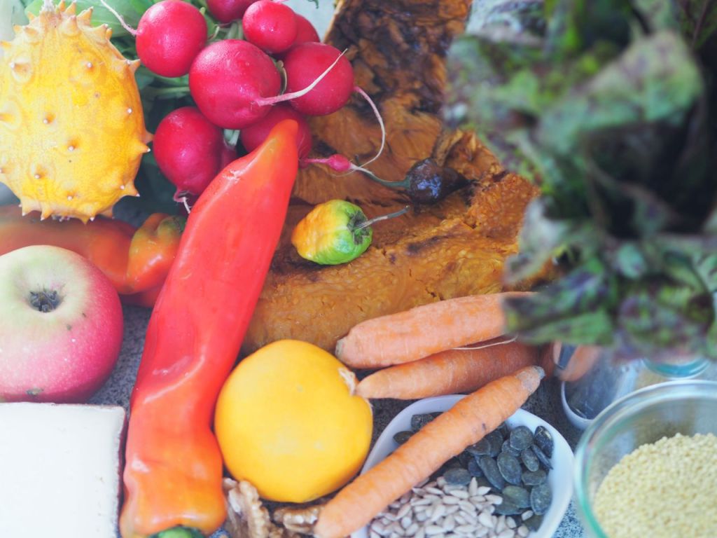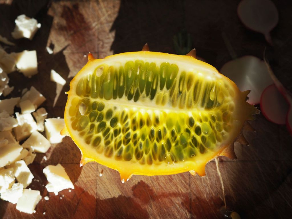 Hirse in Salzwasser kochen abgießen und auf die Seite stellen. Den gebratenen Kürbis würfeln Karotten in Scheiben schneiden Karotten auf der Grillplatte anbraten die Kürbiswürfeln kurz mitbraten. Gemüse mit der Hirse mischen. Kürbiskerne, Sonnenblumenkerne und Walnüsse anrösten und auf die Seite stellen. Dressing vorbereiten gegrillte Paprika Joghurt einen Teil von den angerösteten Nüssen Olivenöl Saft und Schale von einer Orange im Standmixer pürieren. Die Marinade zur Hirse-Gemüse-Mischung geben und unterheben. Bis zum Servieren einfach ziehen lassen. Radieschen und Äpfel in feine Stifte schneiden. Salz und Weißweinessig zusammenrühren ziehen lassen. Anrichten Hirse-Gemüse-Mischung auf den Teller geben mit Apfel und Radieschen mit der restlichen Nußmischung bestreuen. Ausgelöste Kiwano und in Scheiben geschnitten dazu servieren, sowohl den zerbröselten Schafkäse und die Habanero-Chili dazu geben. Essen Ganz wichtig: Chili vorher ein kleines Stück nur kosten. Dazu reichlich Joghurt. Kein Brot.