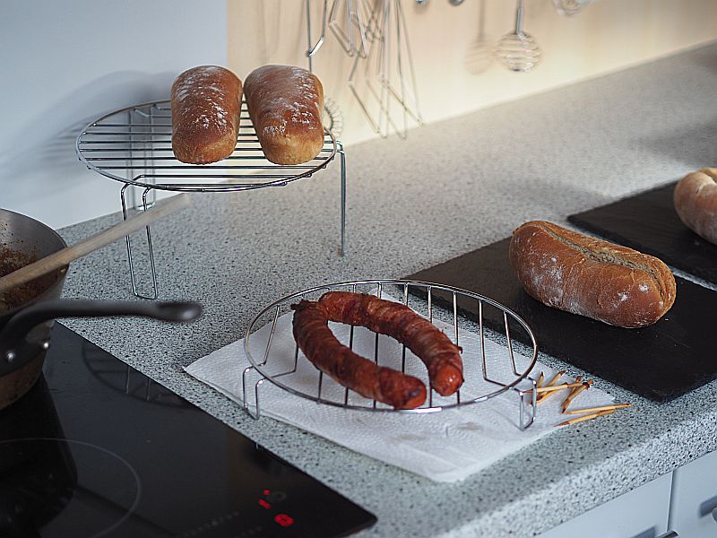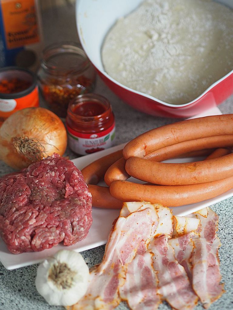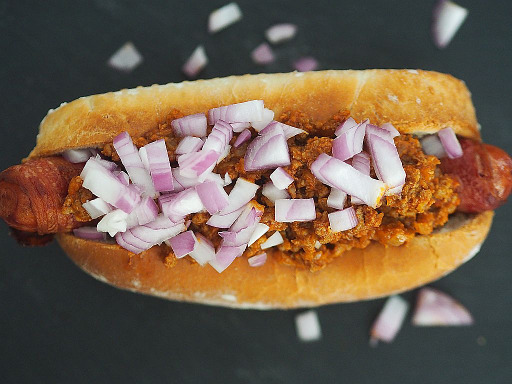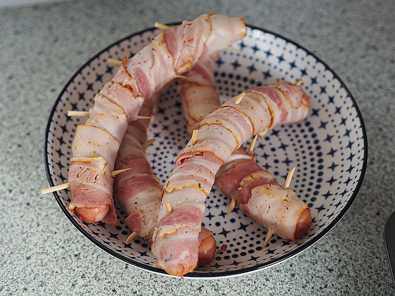 Brötchen 21 Gramm (also einen Würfel) frische Germ (Hefe) und 60 Milliliter lauwarmes Wasser, eine Prise Zucker und einen Teelöffel Mehl verrühren und aufgehen lassen. 120 Milliliter lauwarmes Wasser mit 300 Gramm Mehl, einem Teelöffel Salz, drei Eßlöffel Zucker und vier Eßlöffel Olivenöl verrühren, die Germ-Mischung dazu geben und mit dem Knethaken den Teig rühren bis von der Innenwand der Schüssel der Teig herunterkommt. Zudecken und auf einem warmen Platzerl zwei Stunden lang gehen lassen. In der Zwischenzeit die klassische Hot Dog Chili Sauce vorbereiten. Eine große fein gehackte Zwiebel in zwei Eßlöffel Olivenöl anschwitzen. Vier geriebene Knoblauchzehen dazu geben und kurz mitschwitzen, einen Teelöffel Kreuzkümmel, einen Teelöffel getrocknete Chili eine Prise Cayenne-Pfeffer und Hundertfünfzig Gramm Tomatenmark dazu geben und kurz mitschwitzen. 400 Gramm Rinderfaschiertes dazu rühren. Fünf bis sechs Minuten anschwitzen. Etwa 200 Milliliter Rinderbrühe dazugießen. Mit Salz abschmecken. Etwa dreißig Minuten köcheln lassen. So. Zurück zu den Brötchen. Den Teig auf eine bemehlte Arbeitsfläche geben und in vier Teile teilen, alle Teile durchkneten. Mit dem Nudelholz viereckig ausrollen und den Teig mit den Handflächen aufrollen, die Enden zudrücken, die Teile in die Hotdog-Form geben und eine Dreiviertelstunde zugedeckt gehen lassen. Bei 200 Grad etwa eine Viertelstunde backen. Während das Brot bäckt, um die Wiener Würstel Speck wickeln und mit Holzspießchen befestigen. Und in Butterschmalz frittieren.