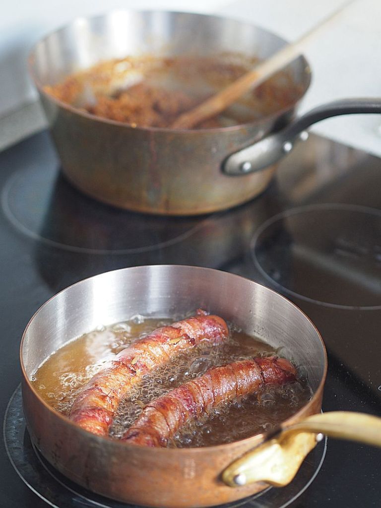 Als Katerfrühstück nach Silvester gelüstete es uns nach einem Hot Dog. Nach einigem Kochbuchwälzen von „Hot Dogs“ von Russel van Kraayenburg wurde die Entscheidung gefällt zugunsten des Danger Dogs; dieser Hot Dog wird mit Bacon umwickelt, aber wir hatten ja vorgesorgt und hatten Würstel und Speck bei der Hand. Der Danger Dog ist genau das Richtige, um einen Kater zu vertreiben. Achtung das ist kein Kindergeburtstag mit Senf und Ketchup, der ist scharf! Die Hot Dog Sauce wird mit reichlich Chili, Knoblauch und Cayenne-Pfeffer gemacht. Der Danger Dog kann seine Herkunft aus Mexiko nicht verleugnen. Er entstand in den Fünfzigerjahren des Zwanzigsten Jahrhunderts in Tijuana. Illegale Straßenverkäufer brachten ihn unters Volk, daher der Name „Danger Dog“. In New Jersey wurde er abgewandelt und hier ist er nun: