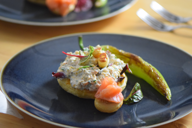 Auf Buchenholz geräuchterte Lachsrückenfilets mit roten Linsen als Salat in einem griechischen Joghurt abgeschmeckt mit Petersilie und Zitrone auf Blätterteigtellern.