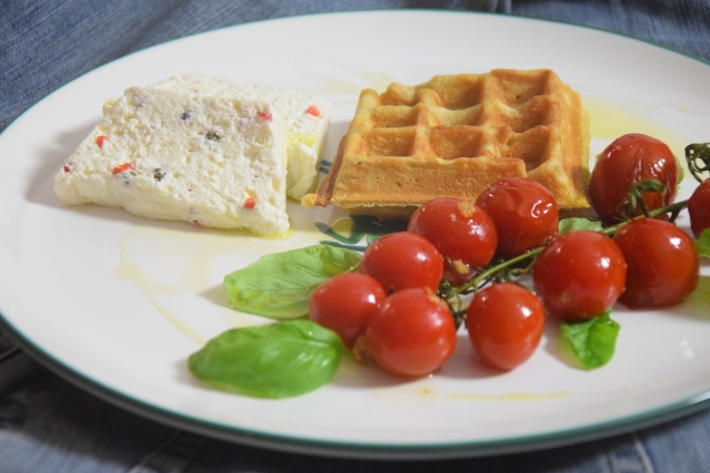 Von Hadn-Platln zu Hadn-Waffeln. Waffeln aus Buchweizen mit einer Topfenterrine mit eingesprenkelten Chili und grünem Pfefferkörnen und zu scharfe Kirschtomaten.
