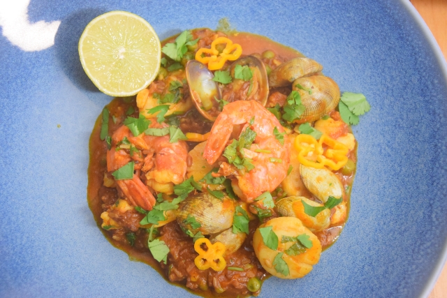 Der Winterkabeljau (Skrei) ist wieder unterwegs in der Norwegischen See und schon haben wir ihn in der Pfanne. Hier ist er vereint mit roten Wildgarnelen aus Argentinien, Jakobsmuscheln aus dem Nordwestpazifik, Bäckchen vom Anglerfisch aus der Nordsee und Vongole aus Frankreich. Mit unter anderem Tomaten, Chili und auch Erbsen ergibt das ein leicht scharfes, in Richtung asiatisch abgeschmecktes Fisch-Curry.