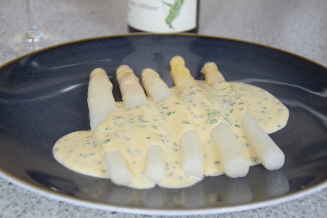 Kaltes, dünn aufgeschnittenes Roastbeef und dazu weißer Spargel mit einer Sauce, die einer Mayonnaise ähnlich ist, mit Schnittlauch und Eiweißstückchen. In Südtirol isst man den Spargel so!