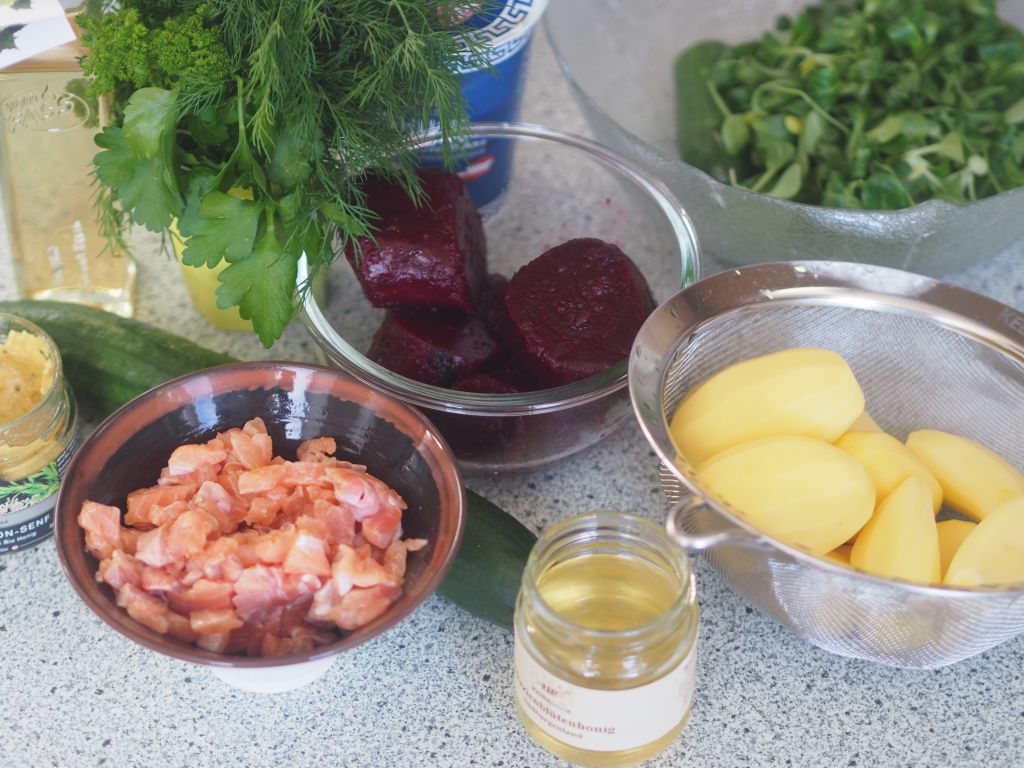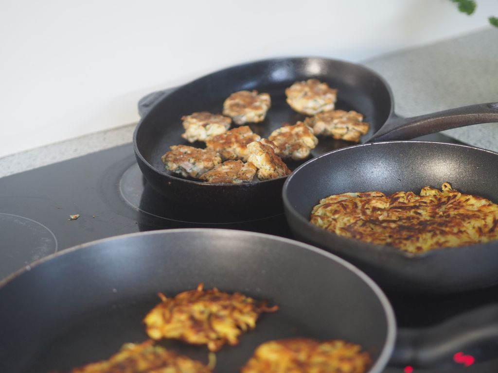 „Die Erdäpfel sind vielzuviel“, sagte die Hofköchin. Aber wir haben unseren Grundbedarf berechnet nach der Harrison-Benedict-Formel aus dem Buch „Abnehmen mit Kohlenhydraten“ von Daniela Kielkoswki und Bettina Matthaei. Man muß soviel Kohlenhydrate essen, damit das Gehirn nicht glaubt, es muß sparen. Außerdem benötigt man die Energie aus den Kohlenhydraten zur Bewältigung der Tagesarbeit. Wir werden uns erst daran gewöhnen müssen. Das dauert etwa 4 Wochen, denn so lange dauert die Aktivierungsphase lt. Buch. Es gab Kartoffelrösti mit Laibchen aus Seesaibling. Seesaibling hatten wir noch von gestern.