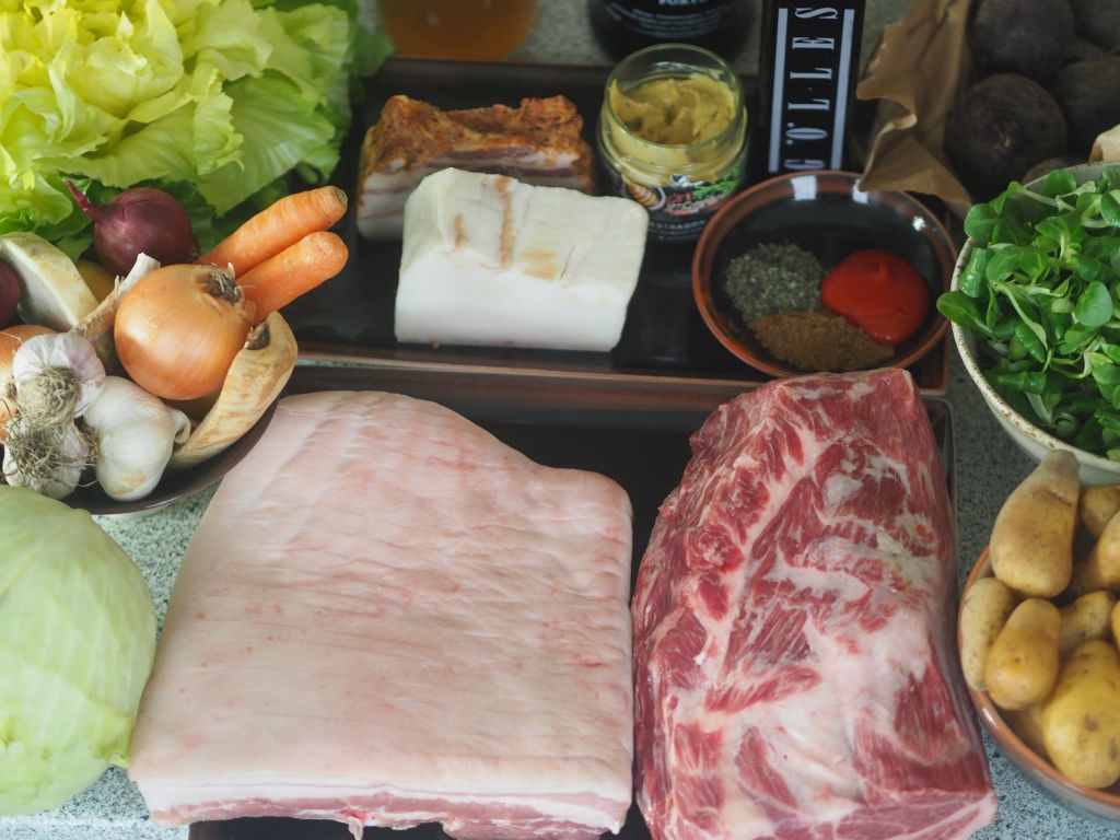 1,2 kg Schweinebauch vom Sonnenschwein, 2 Zitronengras, 12 Stück Knoblauchzehen, 1 Stück Ingwer, eine Handvoll grobes Meersalz, Noilly Prat.