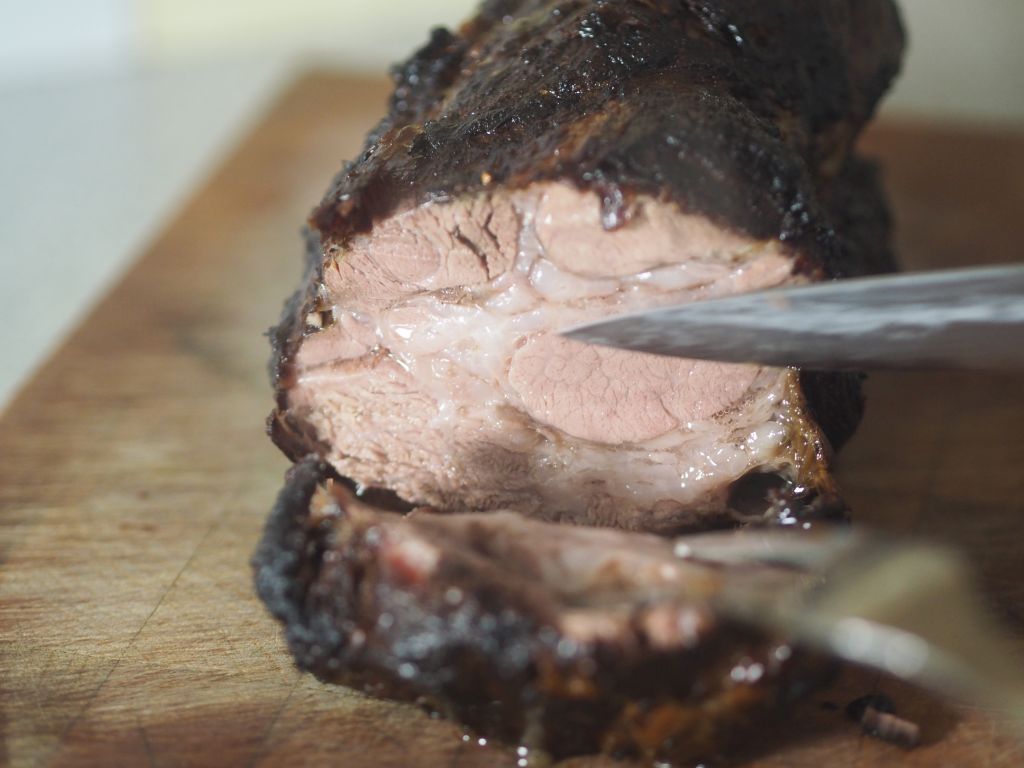 Damit der Schweinsbraten schön knusprig wird, hat ihn die Hofköchin mit Zitronensaft beträufelt, dann trocknen lassen, ihn mit grobem Meersalz bestreut und bei 240°C ins vorgeheizte Backrohr geschoben. Nach einer Stunde herausnehmen, das alte Salz obekletzeln und frisches Salz darauf gegeben und wieder ins Backrohr schieben, nach 20 Min. herausnehmen, das Salz heruntergeben, mit Noilly Prat aufgießen, aber nicht auf die Schwarte kommen, zurückdrehen auf 190°C, und eine halbe Stunde braten lassen.