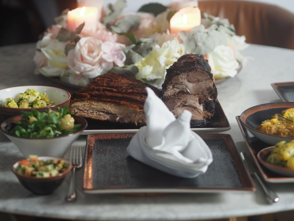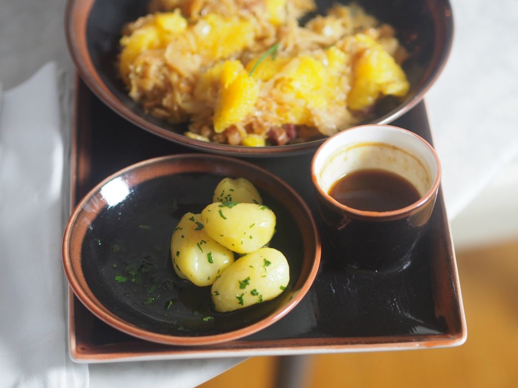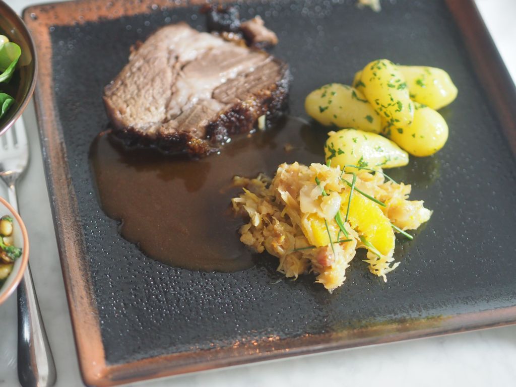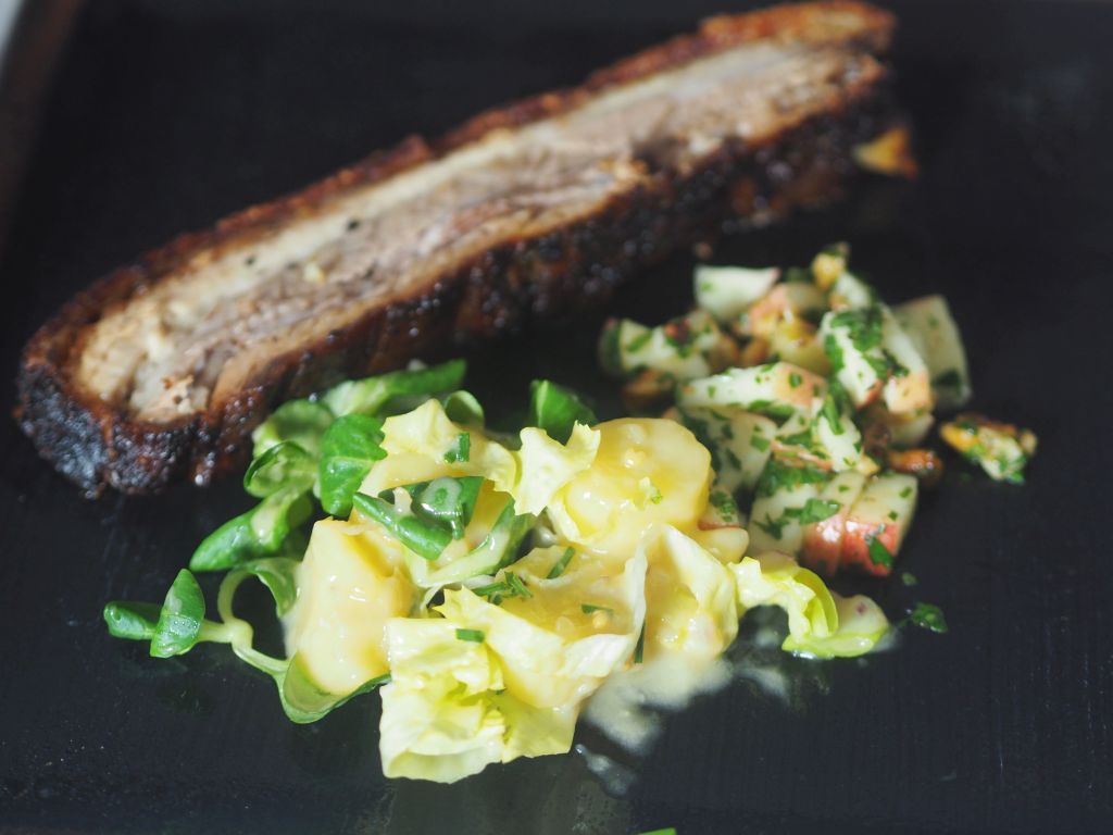In manch Schule gibt’s kein Schweinefleisch mehr, das ist sehr bedauerlich. Wir können mit so viel alttestamentarischer Rückwärtsgewandtheit nicht wirklich was anfangen und lassen uns davon auch nicht beirren. Wir haben sogar einen Schritt vorwärts gemacht und den Schweinsbraten ein bisserl modernisiert. Unser Schweinsbraten war vom Sonnenschwein, einer Kreuzung aus Duroc (Nord-Europa) und Schwäbisch Hällisch (Deutschland/Schwäbisch Hall). Die Schwarte vom Bauchfleisch wird resch angebraten, damit es so richtig kracht beim Einebeißen. Es wird mit einer geschmeidigen Kürbiscreme serviert, dazu kommt ein Walnuß-Apfel-Crunch. Das Schwein selbst kommt aus der Südoststeiermark, an der Grenze zum Südburgenland, ungefähr auf der Höhe von St. Michael, und konnte dort die Erde umgraben. Ein Gemischter Satz aus Wien rundet die Sache ab, der kann auch ziemlich resch sein.
