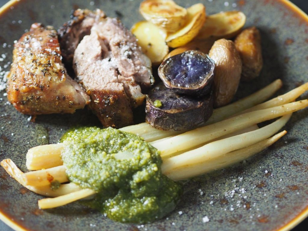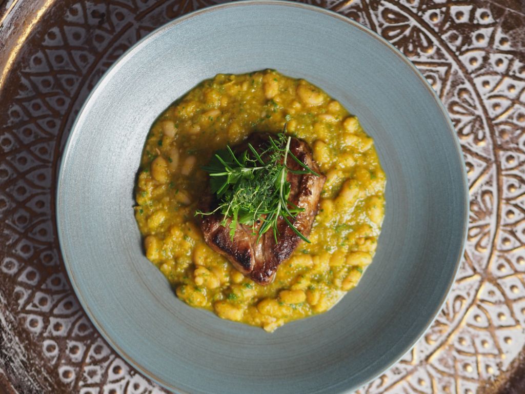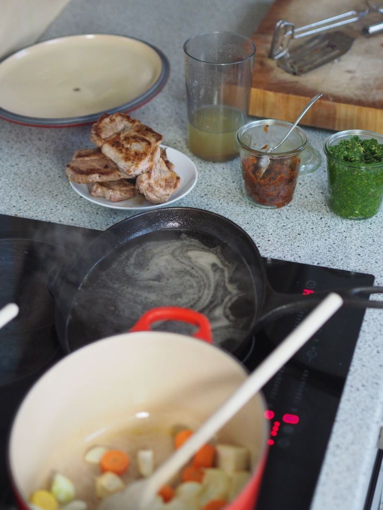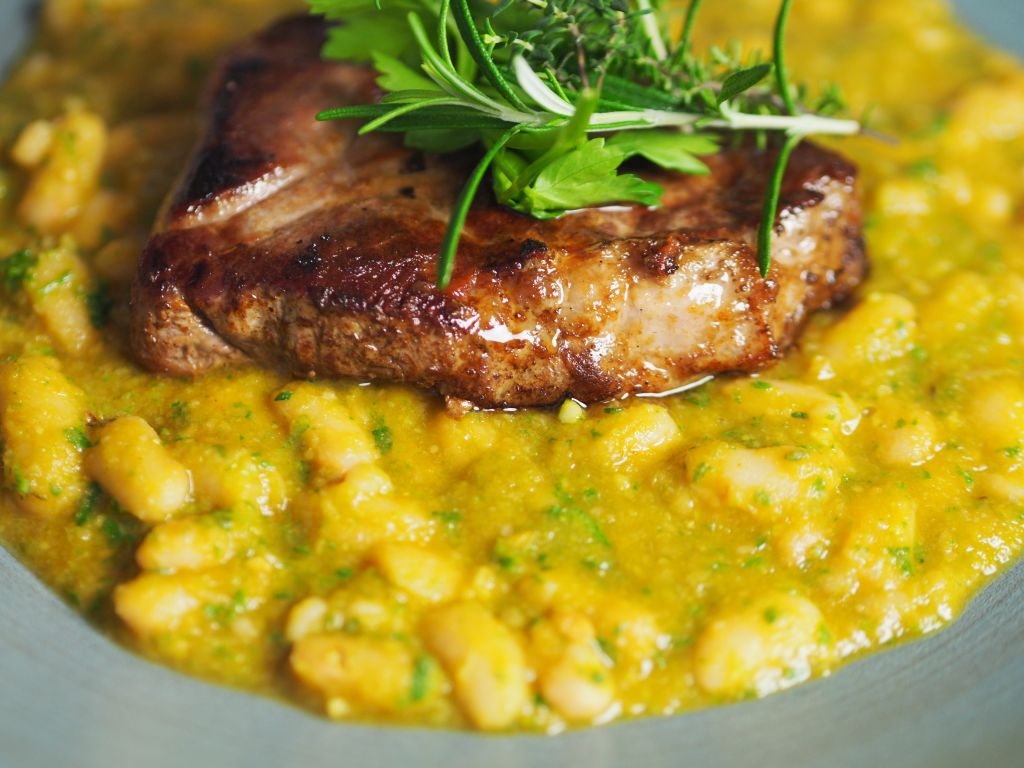 - In der Pfanne gebratene Schweinsschulter mediterranée mit weißen Bohnen, Soffrito und Piccata-Sauce
