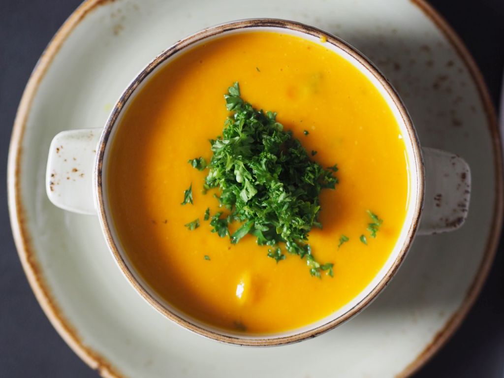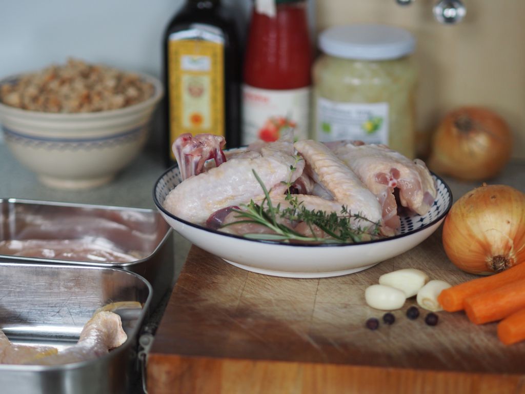 Hühnerbrühe Brust und Schenkel vom Hähnchen abtrennen, im Kühlschrank bis zur weiteren Verwendung aufbewahren. Flügel und den Rest abwaschen und zwei Mal in heißem Wasser in einem Topf aufkochen und abgießen, um den weißen Schaum loszuwerden. Das geputzte und grob geschnittene Suppengrün (Karotten, Sellerie, Lauch und gelbe Karotte, Petersilstängel), ein Lorbeerblatt, Wacholderbeeren, Pfefferkörner, Thymianzweige, Rosmarinzweige, Apfelessig und Salz dazu geben und drei bis vier Stunden simmern lassen. Zwei kleine Tomaten und Safranfäden in der letzten Stunde dazu geben.