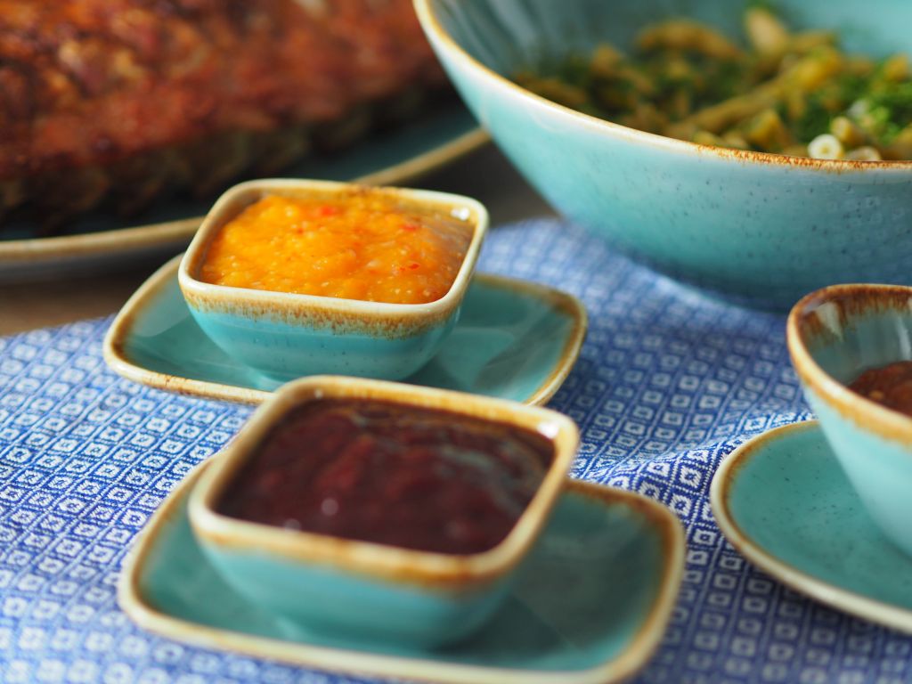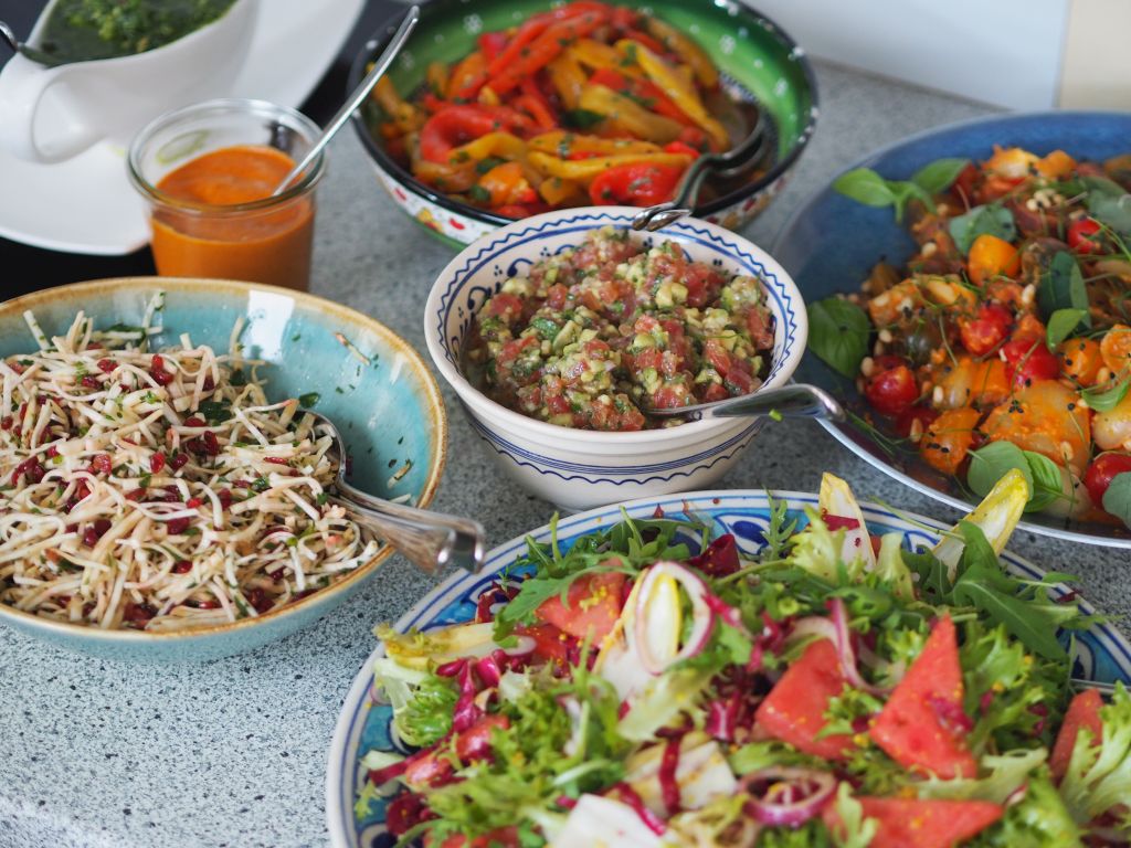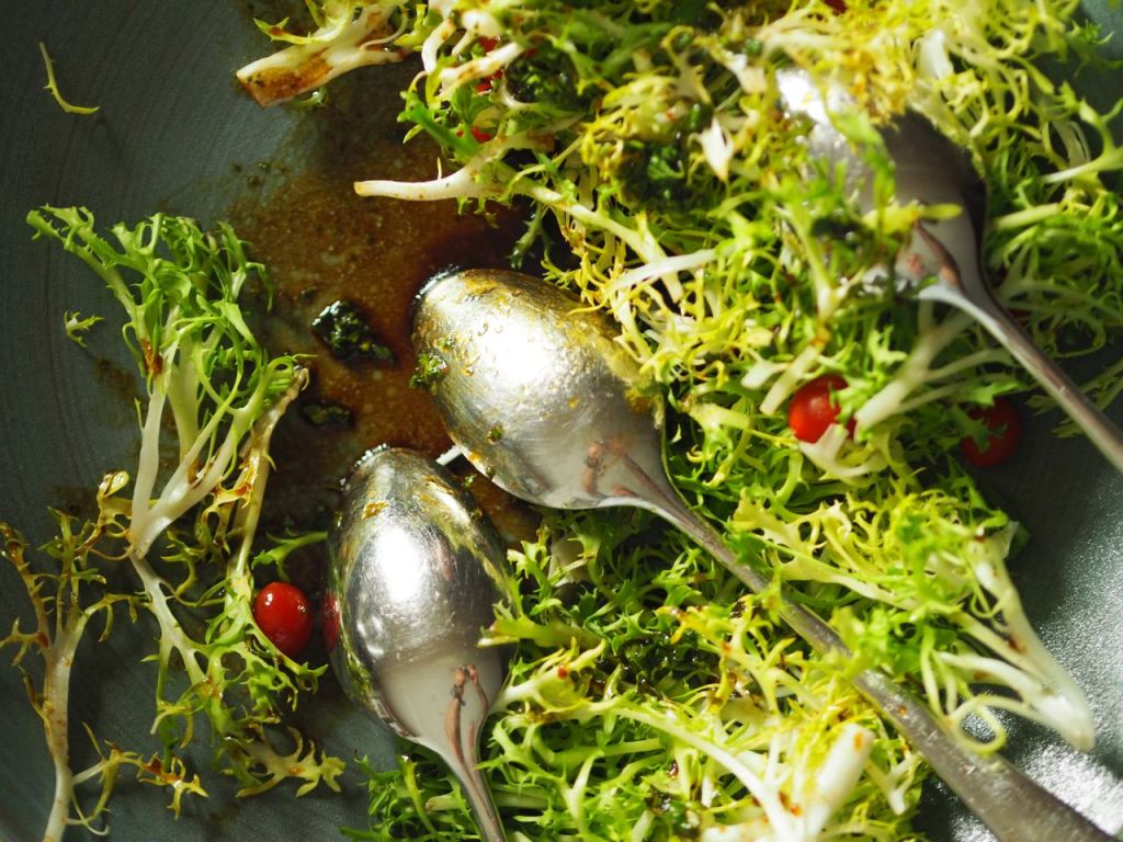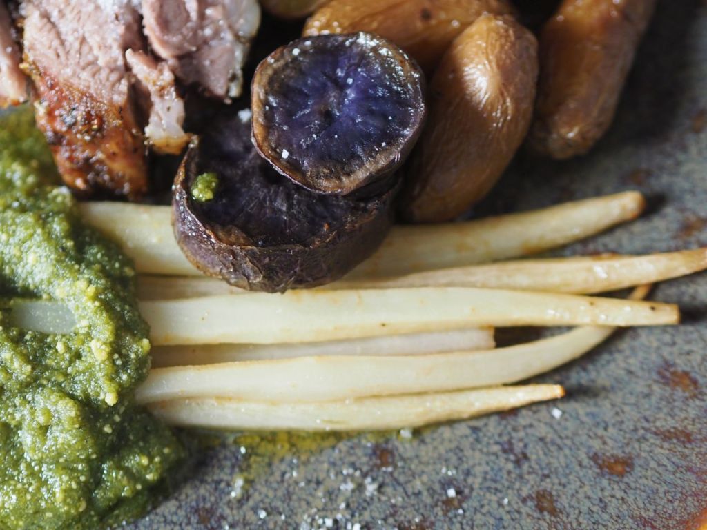 Picada: 75 g Petersilienblätter mit 120 ml Olivenöl, drei Knoblauchzehen, 100 g geröstete Haselnüsse, mit sechs bis sieben in Folie gerösteten Safranfäden verrühren.