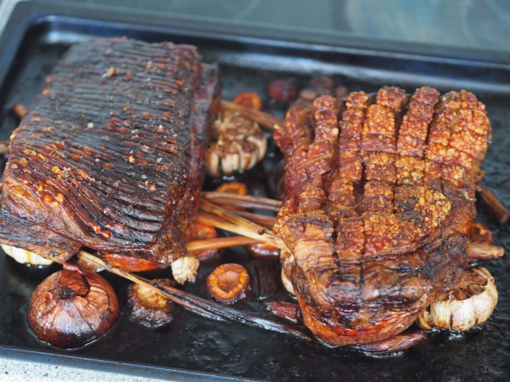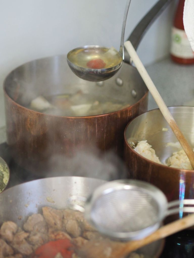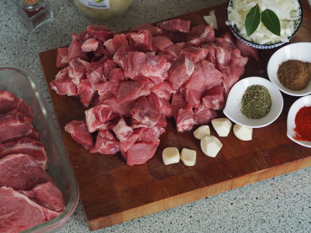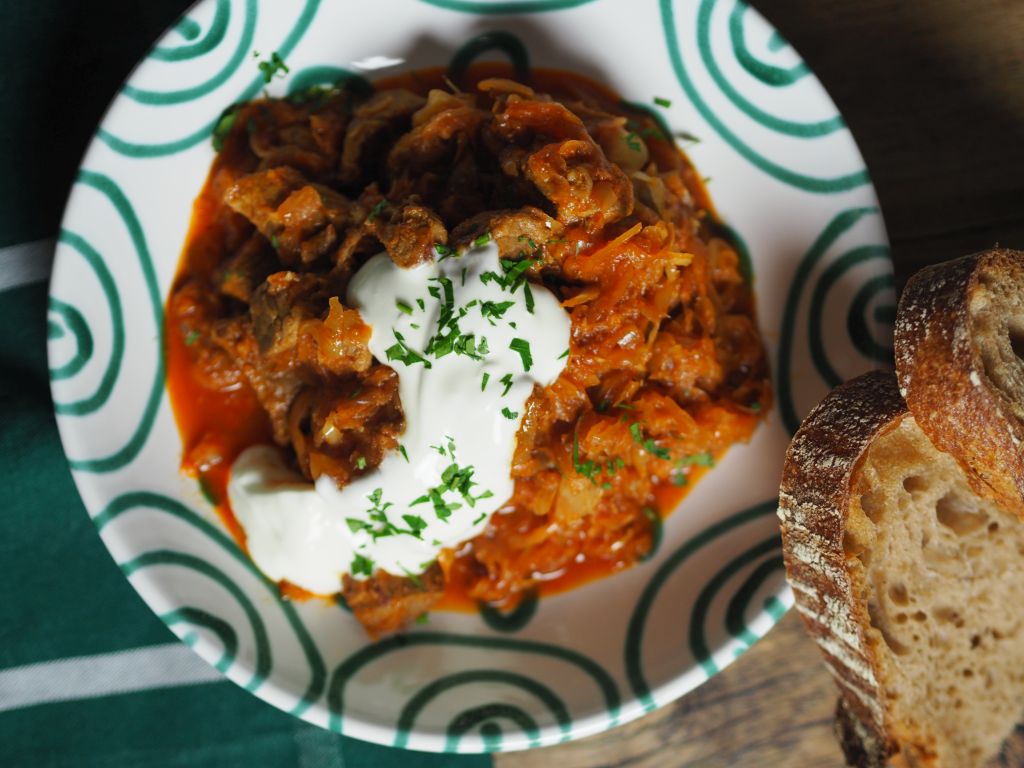 Pörkölt Von den 2 kg Schweinsschulter die Hälfte auf die Seite stellen, den Rest in Würfel schneiden. Eine große, fein gehackte Zwiebel in brauner Butter in einem Topf anschwitzen, die Fleischstücke dazu geben, den Herd aufdrehen, solange braten, bis die Flüssigkeit verdampft ist und den Herd zurückdrehen. Einen Esslöffel Majoran, zwei Esslöffel rotes Paprikapulver, einen Esslöffel Kümmel und vier geriebene Knoblauchzehen einrühren. Dann mit Hühnerbrühe aufgießen, bis das Fleisch bedeckt ist, dafür sind etwa fünf Schöpflöffel notwendig. Mit Salz und Pfeffer würzen, ein Lorbeerblatt dazu geben, gut eine Stunde simmern lassen. In der Zwischenzeit eine Paste zubereiten: einen Esslöffel Paprikacreme (Piros Arany, Rotgold), zwei geriebene Knoblauchzehen, einen Teelöffel Paprikapulver, einen halben Teelöffel Kümmel und Majoran und etwas Wasser verrühren. Wenn das Fleisch schön weich ist, diese Paste einrühren und abschmecken. Vom Pörkölt die Hälfte im Kühlschrank, sowie die restliche Hühnerbrühe, für das nächste Gericht am nächsten Tag aufbewahren.