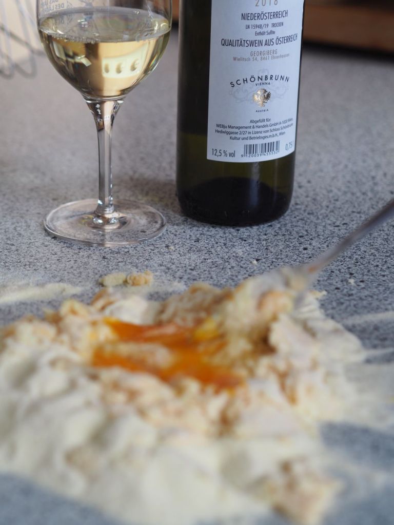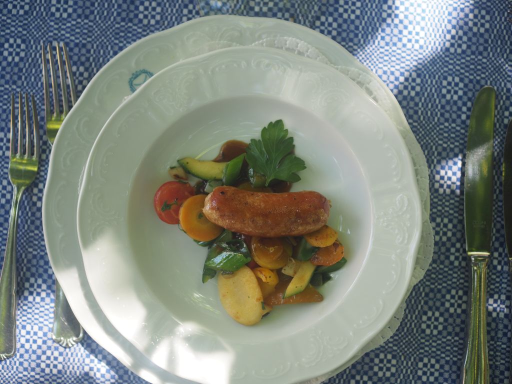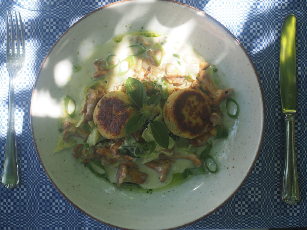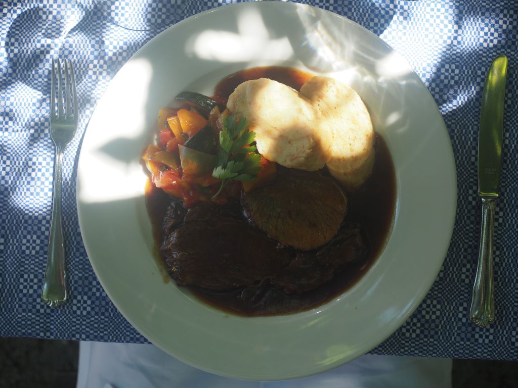 Dann folgte eine Krautsuppe wie ein Eintopf. Das könnte als vollwertige Mahlzeit durchgehen, mit Fleisch und so gut, Dann einmal die Mangalitza-Bratwürstel und einmal ein kleines Beuschel. Auch das ein Hochgenuß! Danach war mal Pause angesagt. Ich bestellte mir ein Glas Cuvée Wiedehopf, 2021, Pfirsich-Aromen, voll und rund. Dann ging es weiter mit einem geschmorten Steppenrind mit Paprika-Zucchinigemüse, wobei ich sagen muß, das Gemüse war ein Gedicht, das Fleisch natürlich auch, aber beim Gemüse hat es mich umgehauen. Die Küchenfee nahm die Eierschwammerl mit Rahmkohl und Grießlaibchen, auch sehr gut, ich kann es nicht beschreiben.