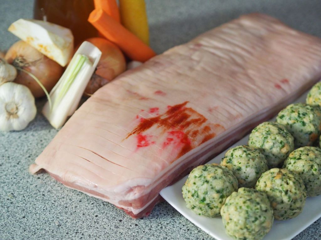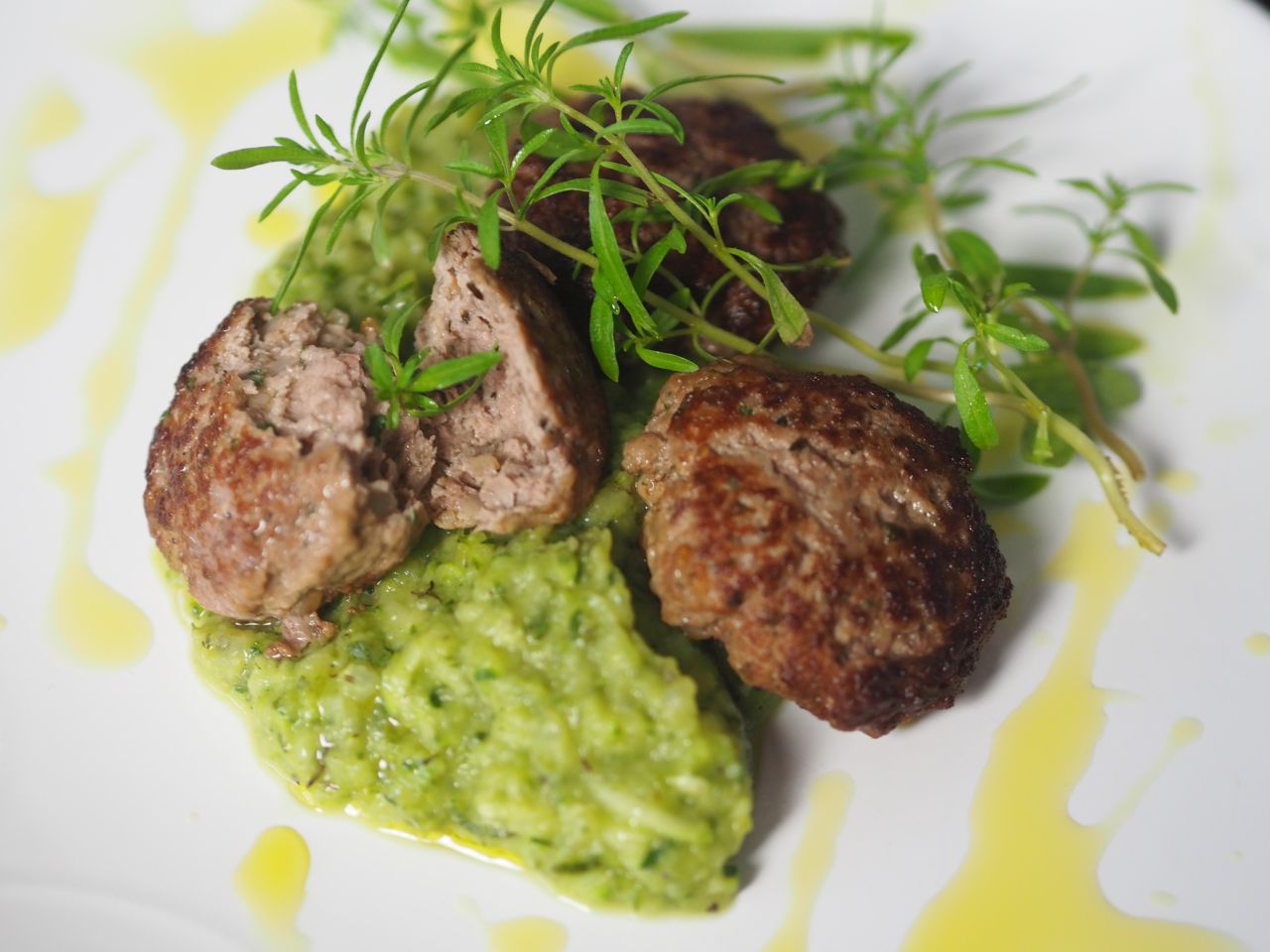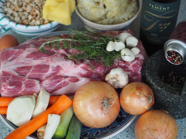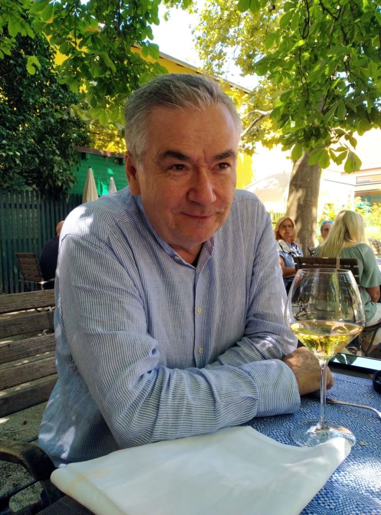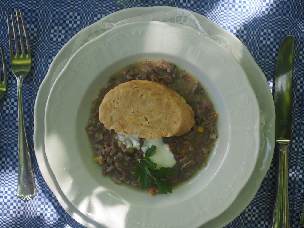 Dann folgte eine Krautsuppe wie ein Eintopf. Das könnte als vollwertige Mahlzeit durchgehen, mit Fleisch und so gut, Dann einmal die Mangalitza-Bratwürstel und einmal ein kleines Beuschel. Auch das ein Hochgenuß! Danach war mal Pause angesagt. Ich bestellte mir ein Glas Cuvée Wiedehopf, 2021, Pfirsich-Aromen, voll und rund. Dann ging es weiter mit einem geschmorten Steppenrind mit Paprika-Zucchinigemüse, wobei ich sagen muß, das Gemüse war ein Gedicht, das Fleisch natürlich auch, aber beim Gemüse hat es mich umgehauen. Die Küchenfee nahm die Eierschwammerl mit Rahmkohl und Grießlaibchen, auch sehr gut, ich kann es nicht beschreiben.