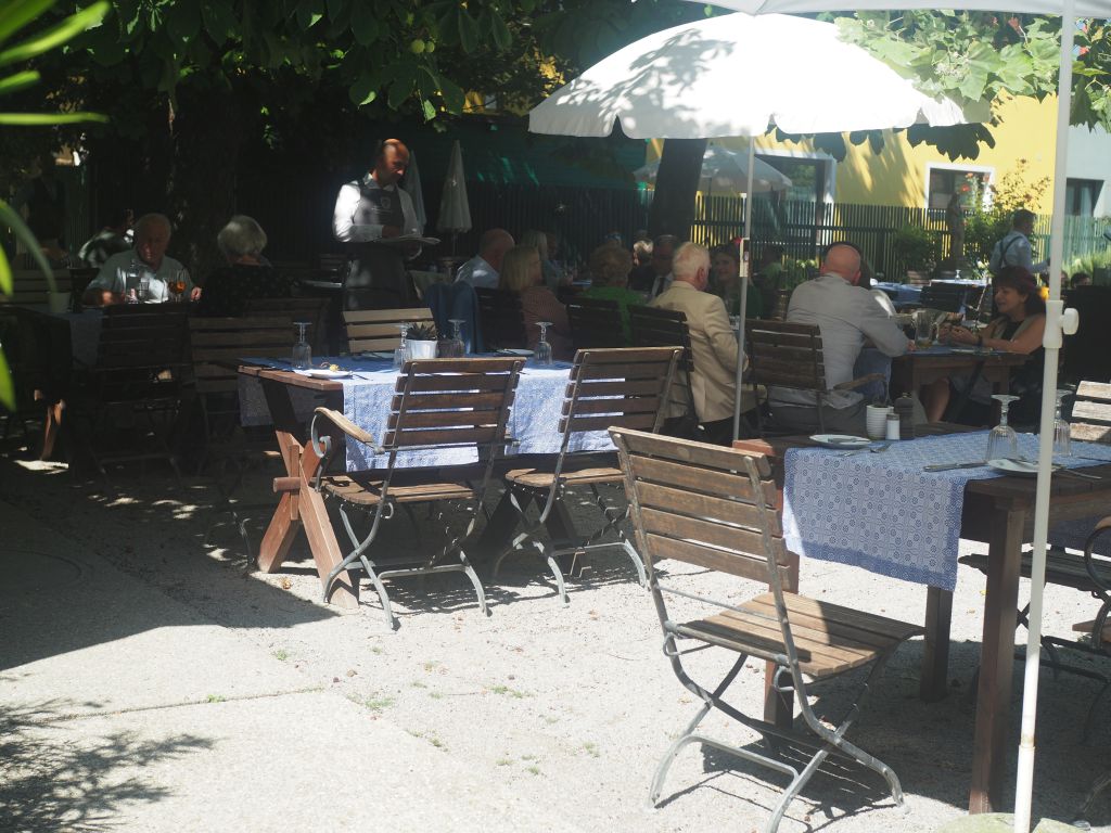 Unser Ziel war Podersdorf am See, wohin man zum Baden fährt, doch wir hatten einen anderen Grund, einen Feinschmeckergrund. Das Gasthaus zur Dankbarkeit befindet sich dort. Wenn man es nicht kennt, fährt man daran vorbei, es liegt an einer Kurve vor dem Ortsende, die aussieht wie in unzähligen anderen Orten. Doch wenn man einmal im Gastgarten ist, hört man von der Straße nichts mehr, außer wenn eine Kolonne Harleys vorbeidonnert, das ereignete sich aber nur einmal. Wir kamen pünktlich wie es sich gehört um 12:00 Mittags an, die Sirenenprobe heulte gerade los, Wir waren die ersten Gäste und so konnten wir uns den Tisch aussuchen. Wir nahmen unter einem der mächtigen Kastanienbäume Platz, sehr schattig. Hier ließ es sich aushalten, trotz sengender Hitze, man braucht keine Klimaanlage, ein Baum genügt.
