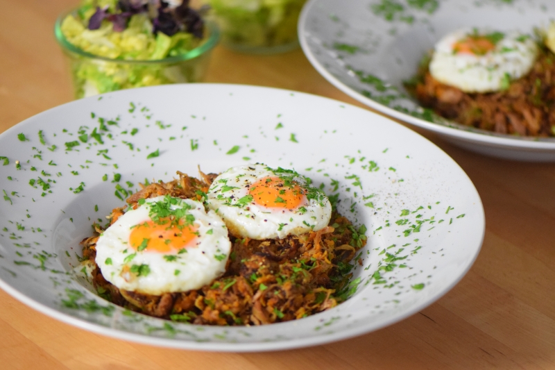 Das Schweinefleisch wurde 6 Stunden im Backrohr butterweich gegart. Mit Süßkartoffeln als Haschee, abgeschmeckt mit Kümmel, Majoran, schwarzem Pfeffer aus der Mühle.