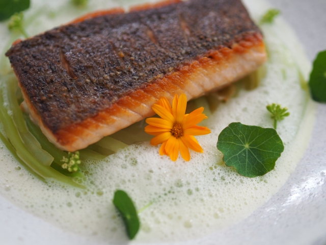 Seeforelle mit Fenchelcreme, Paradeiserfenchel und Ofenparadeiser