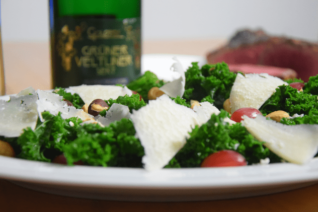 Mal ausprobieren, ob ein Steak auch mit Grünkohl geht. Dazu Weintrauben sowie Haselnüsse. Es geht! Die Zutaten für das Gericht stammen zum Teil aus Italien bzw. aus Deutschland. Der Goldeck-Sekt vom Grünen Veltliner sorgt für die österreichische Herzlichkeit.