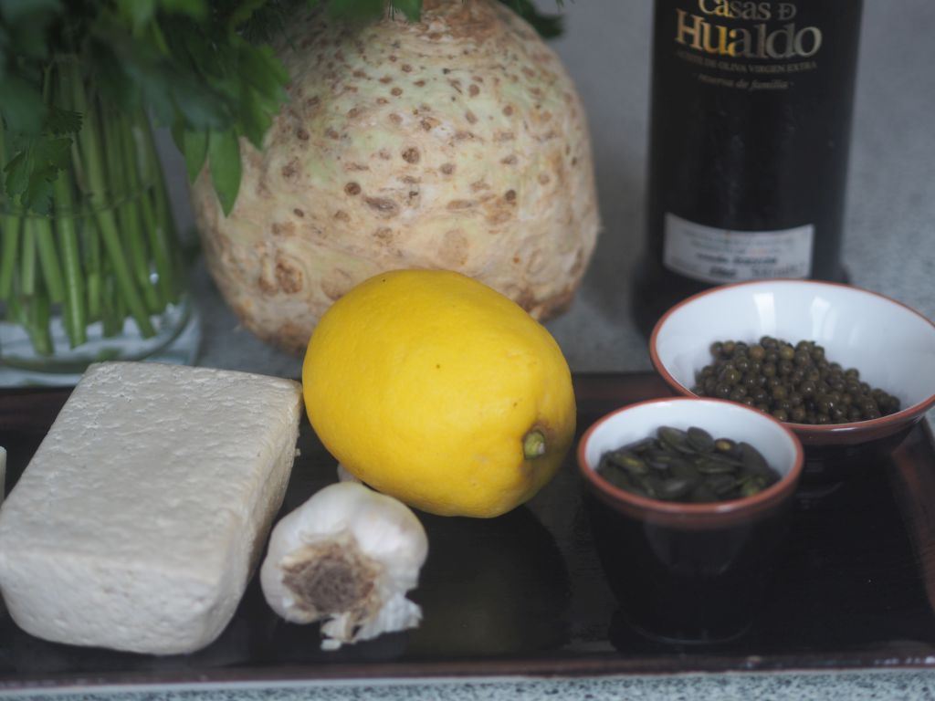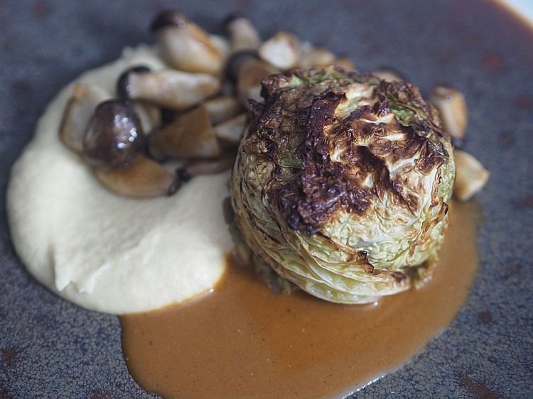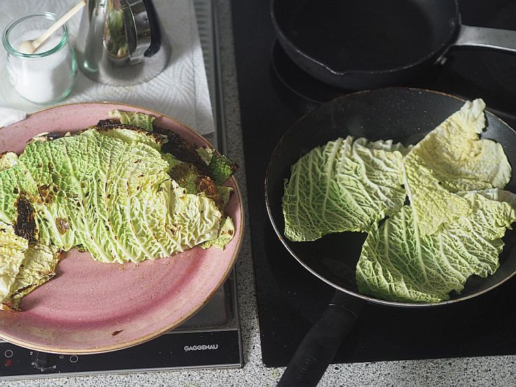 2 Zwiebeln feinhacken. In einem Topf anschwitzen, in der Zwischenzeit den Schweinsbraten zerzupfen, zu den Zwiebeln geben, mit gehacktem Thymian und Salz abschmecken. Gleichzeitig dazu, von den Wirsingblättern den Strunk ausschneiden. In der Bratpfanne in Olivenöl beidseitig anbraten, eines nach dem anderen. Auf einem Teller stapeln. Die kleinen Blätter kleinschneiden und in der Panne anbraten. Zum Fleisch unterheben. Die Ringe mit den Wirsingblättern rosettenförmig auskleiden, sodaß etwas von den Blättern übersteht. Die Füllung hineingeben und die Blätter zuklappen. W u r z e l p ü r e e dreiviertel Knollensellerie, 2 Pastinaken und 5 Petersilienwurzeln schälen und in Stücke schneiden. In einen Bräter geben und mit Salz und etwas Olivenöl vermischen. Zudecken. Im Backrohr bei 140°C weichgaren, etwa 1 Stunde lang. As dem Backrohr herausnehmen. Im Standmixer mit Milch und Butter pürieren. Und alles durch ein Spitzsieb mit dem Mixer unterstützend durchdrücken. Etwas Crème fraîche einrühren, mit Salz abschmecken.