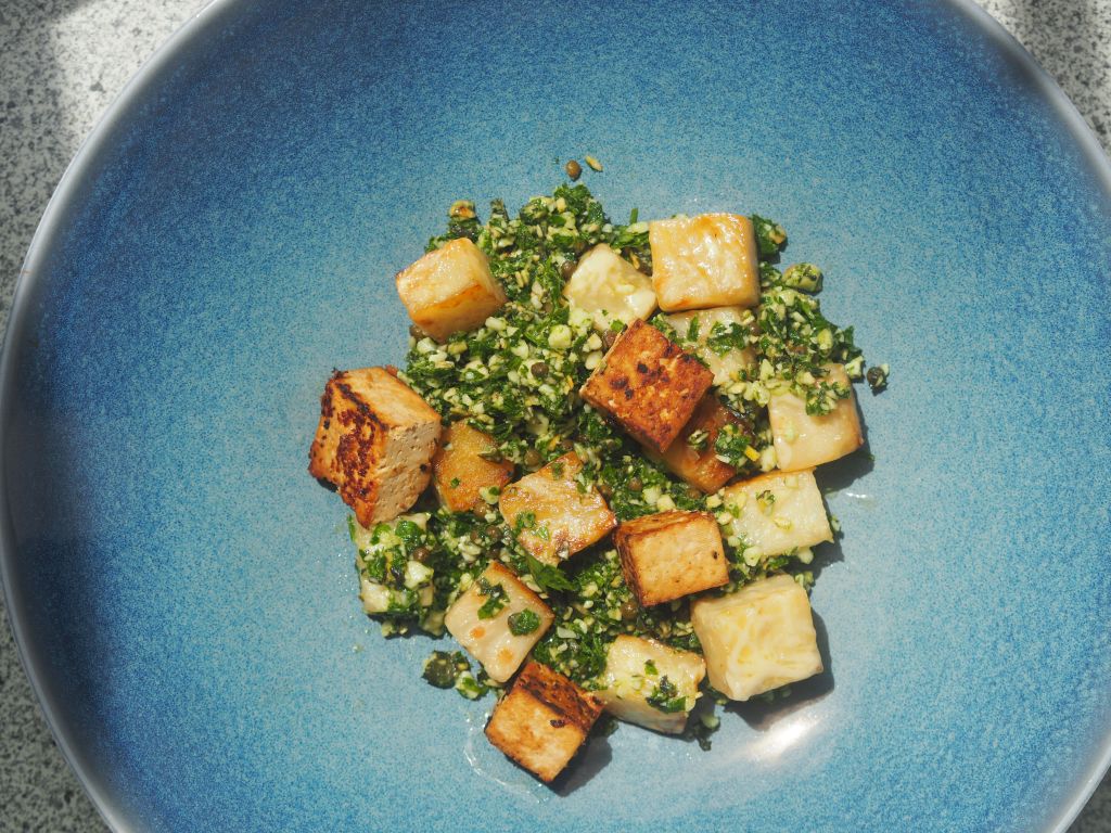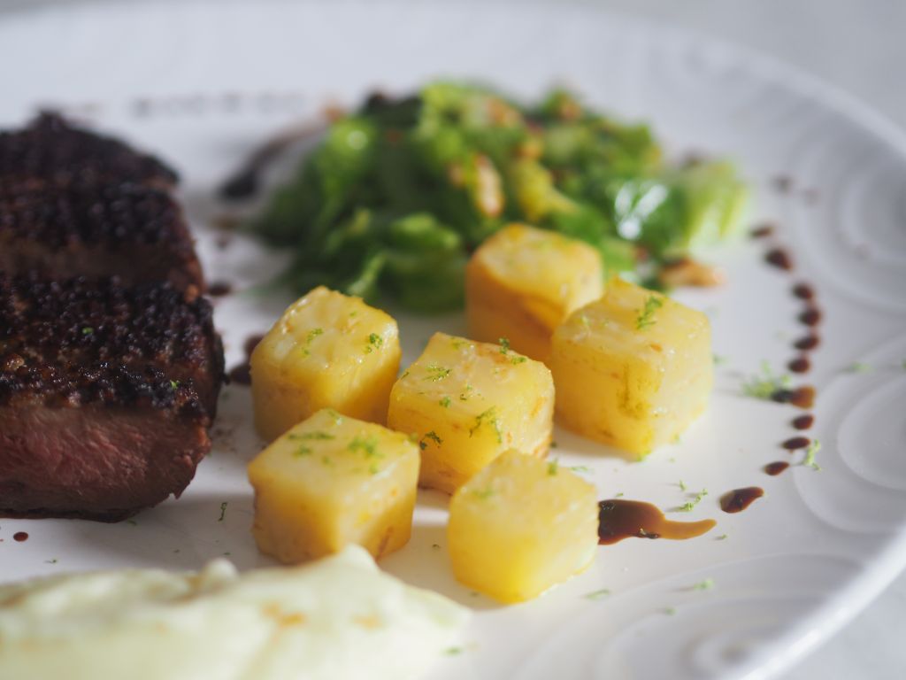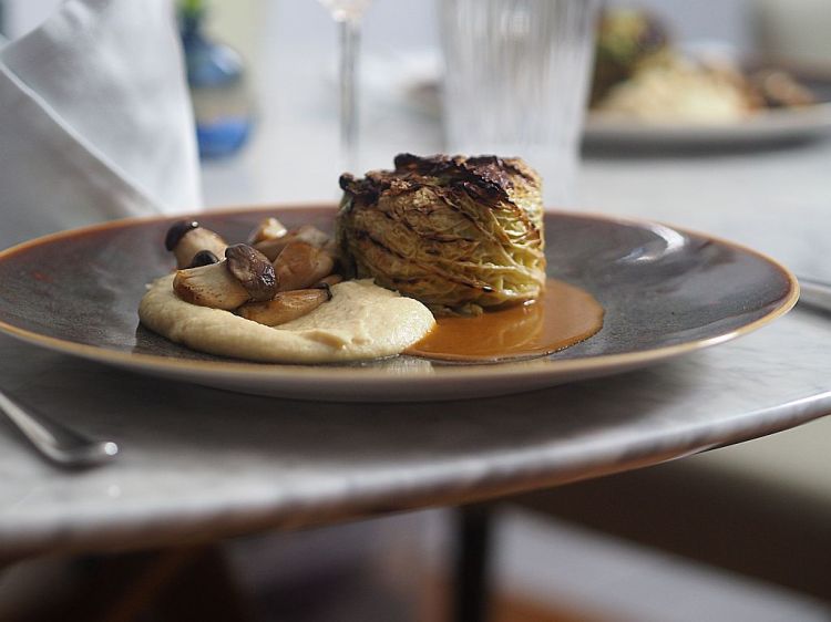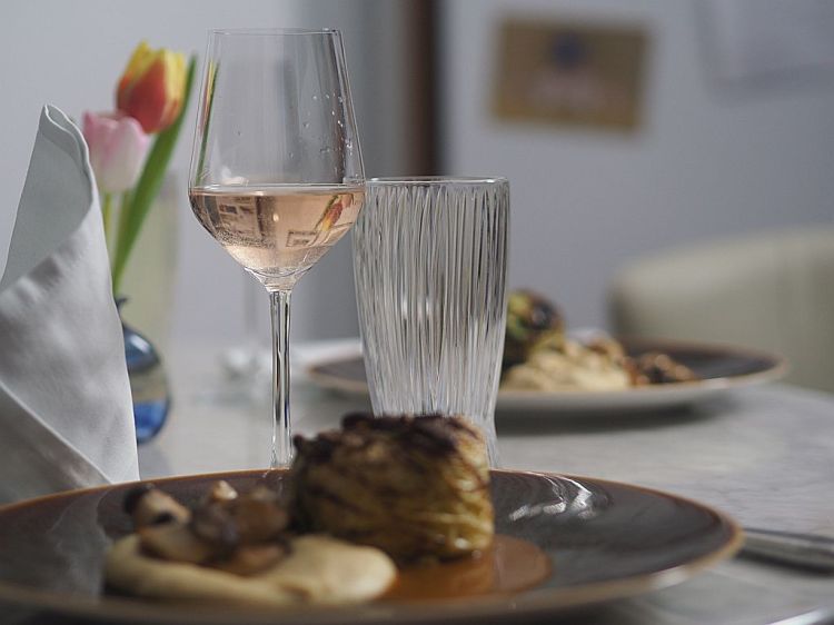 Die Tourtes im Backrohr bei 180°C braten. Mittlerweile die kleinen Kräuterseitlinge in einer Bratpfanne mit etwas Olivenöl schar anbraten. Die Soße aufkochen, mit Maisstärke binden und etwas Crème fraîche einrühren. Das Wurzelpüree warm machen. Anrichten.