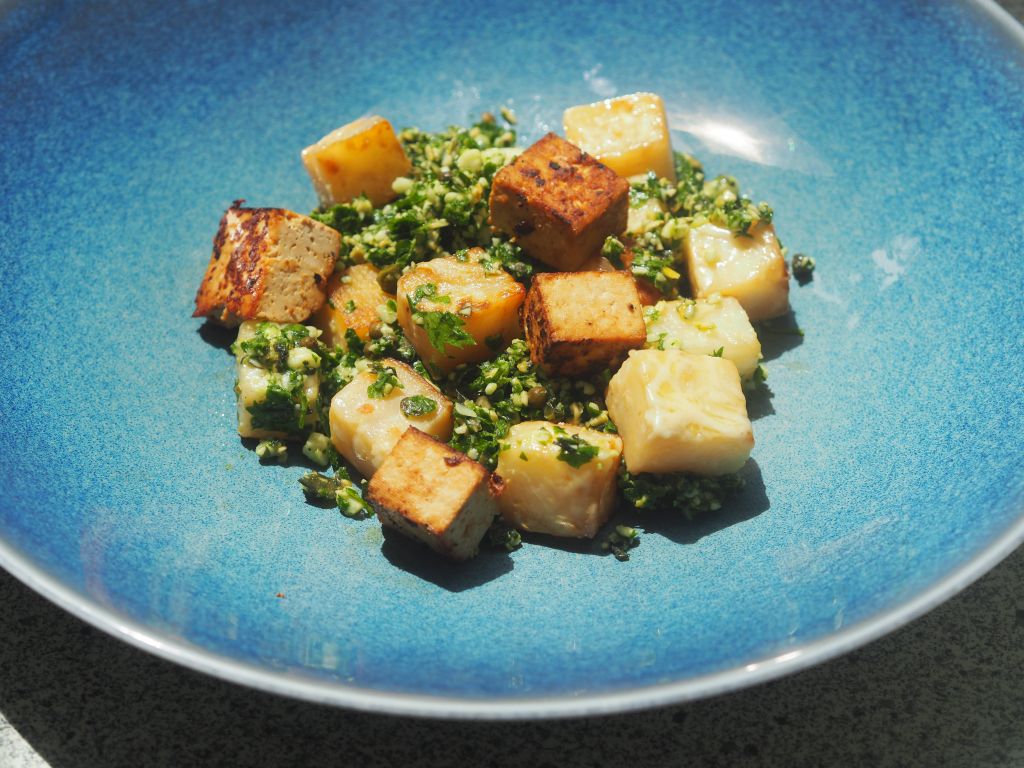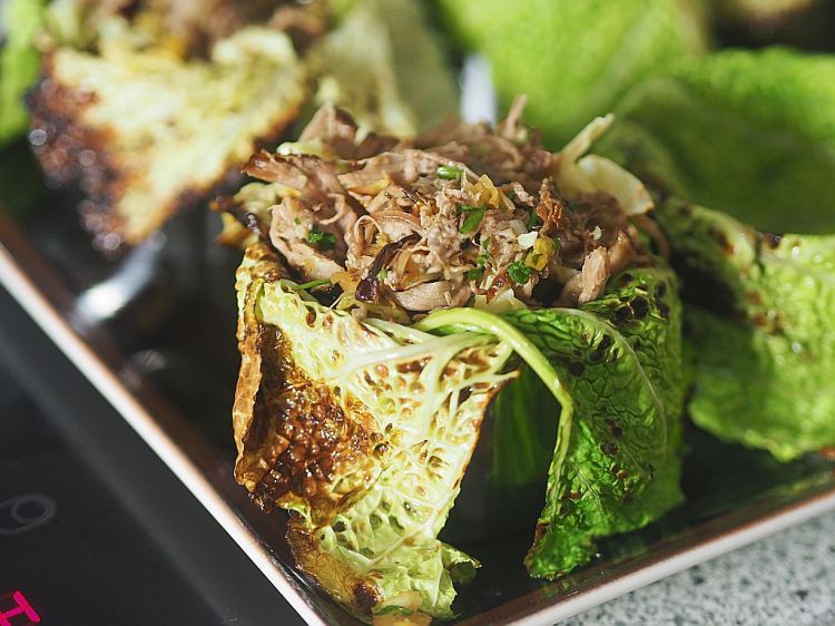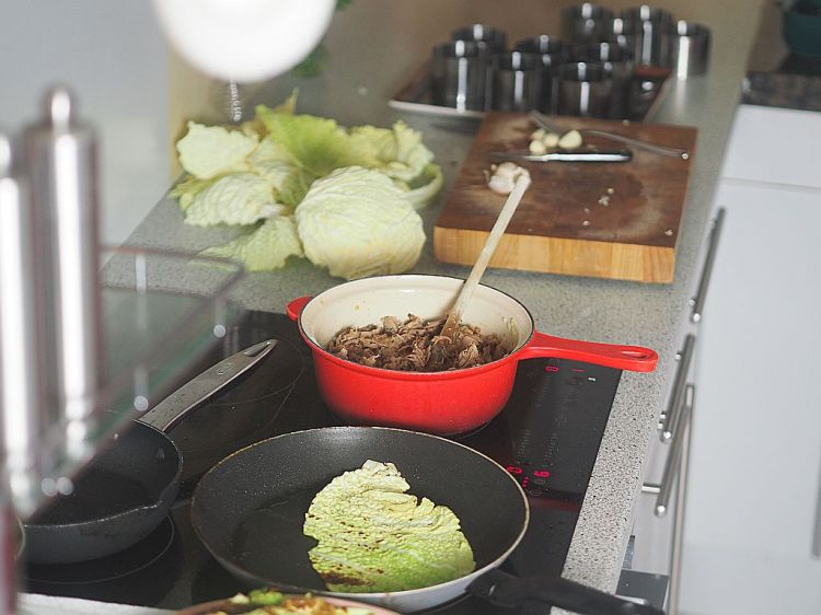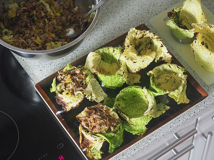 Zerzupftes Schweinefleisch mit Kraut und Zwiebeln in Wirsingblätter gehüllt, dazu ein Püree aus einer Mischung aus Pastinaken, Sellerie und Petersilienwurzel. Es geht auch ohne Kartoffelpüree.