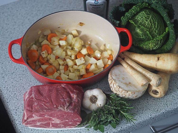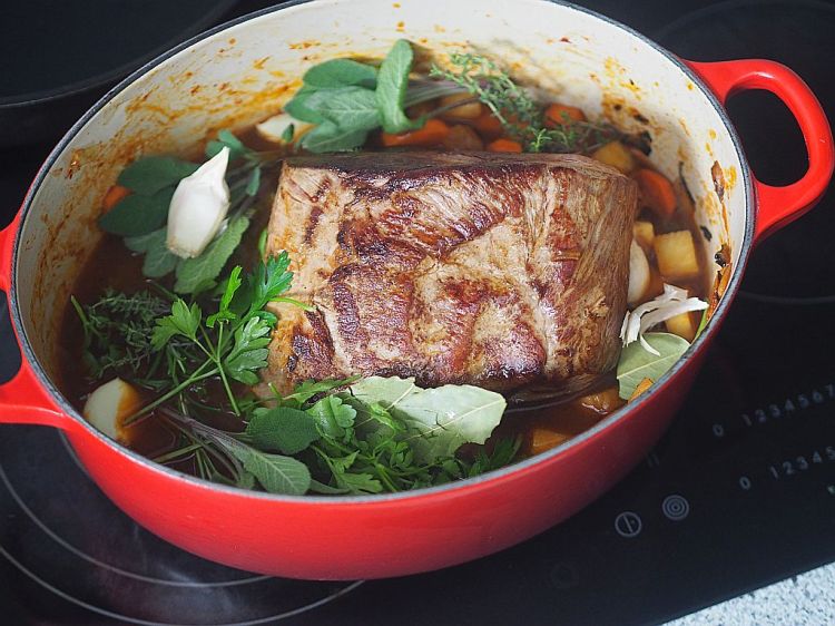 Einen Viertel Knollensellerie, 2 Karotten, 2 Petersilienwurzeln, 4 mittelgroße Zwiebeln würfeln. in den Bräter mit etwas Olivenöl scharf anbraten. 1 EL Tomatenmark dazugeben, mitbraten. Mit Vermouth (Noilly Prat) ablöschen. Gleichzeitig dazu den Schopfbraten in der Bratpanne rundum schön anbraten. Schweinsbraten zum Gemüse geben, nachdem der Noilly Prat eingeköchelt ist, vom Herd nehmen. Mit Wasser auffüllen, sodaß der Schweinsbraten bedeckt ist. 3 Lorbeerblätter, 5 Zweige Thymian, 2 Zweige Rosmarin und Salbeiblätter, 7 zerdrückte Knoblauchzehen und Salz dazugeben. Zugedeckt bei 160°C 3 Stunden schmoren lassen. Bei der Halbzeit das Fleisch wenden. Das Fleisch aus dem Sud heben und auskühlen lassen. Die Soße abgießen und auf die Seite stellen.