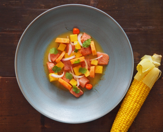 Eine gußeiserne Pfanne mit Olivenöl bepinseln und ordentlich aufdrehen. Den Rotlachs auf der Haut knusprig anbraten. Nur solange bis sich die Haut abheben läßt; Innen muß er nicht durch sein.