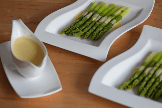 Grüner Spargel mit einer leichten Sahnesauce, ein Hauch von Spargel und ein Hauch von Sauce: für luftige Sommerabende bestens geeignet. Dazu frischfruchtigen Weißwein, zum Beispiel einen Sauvignon Blanc.