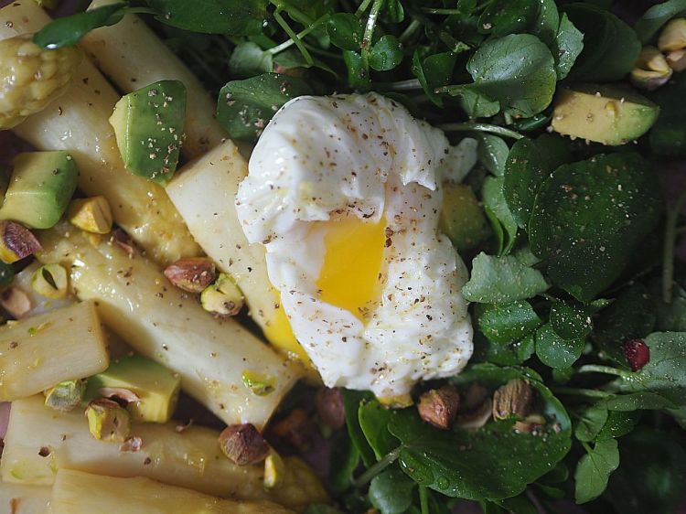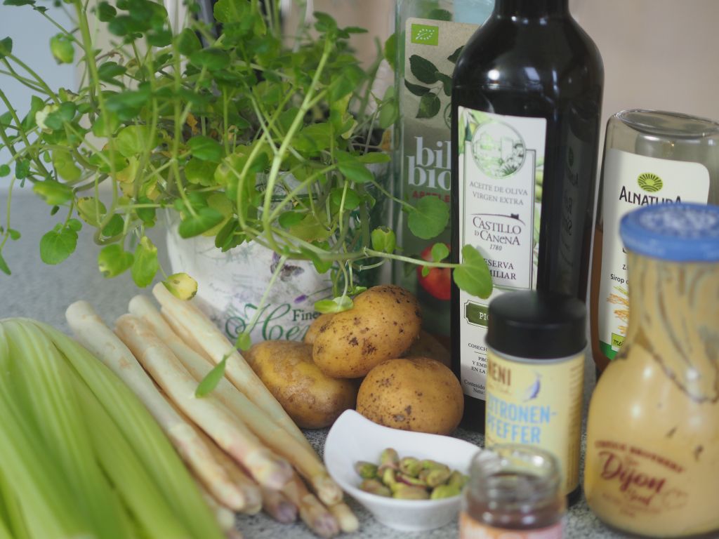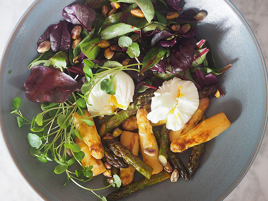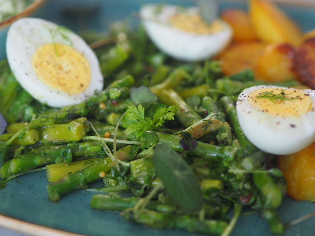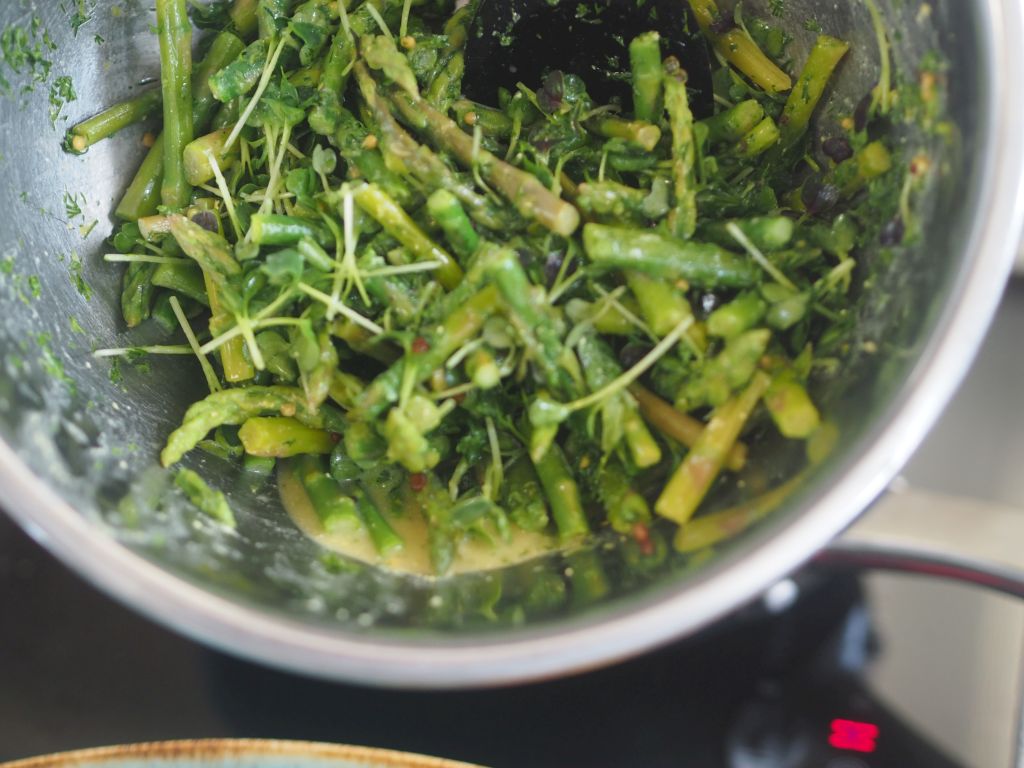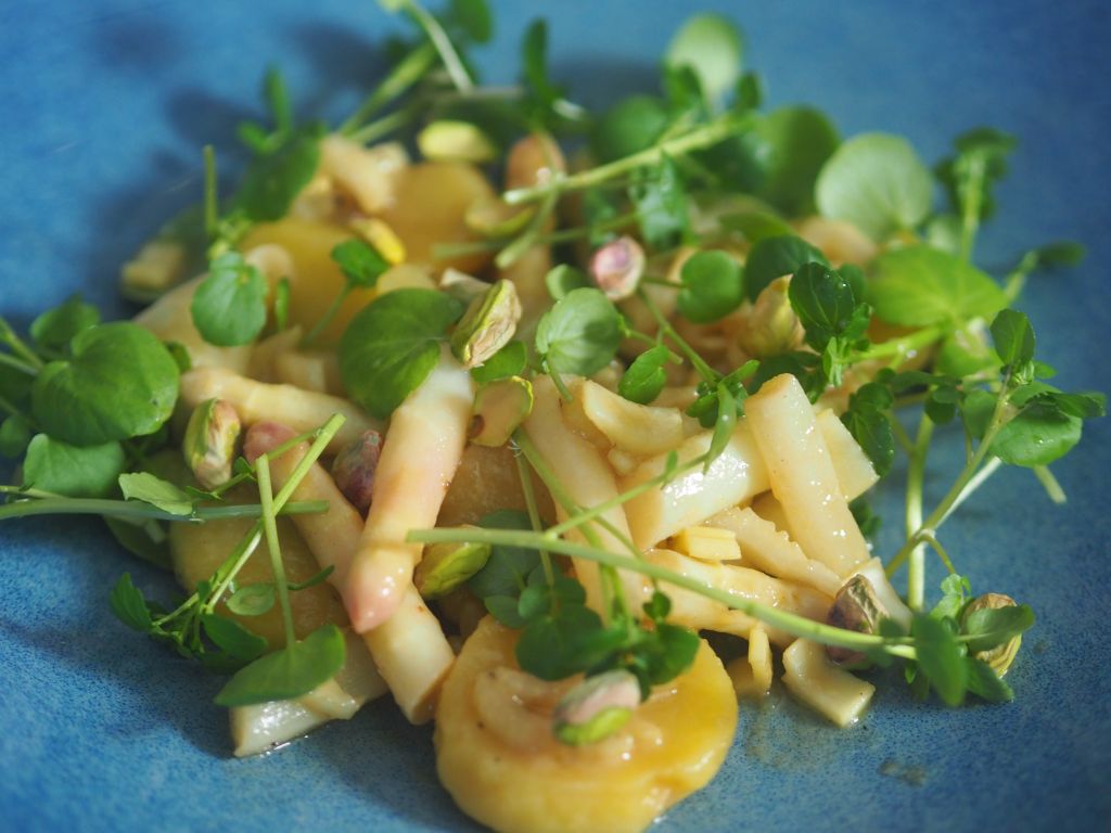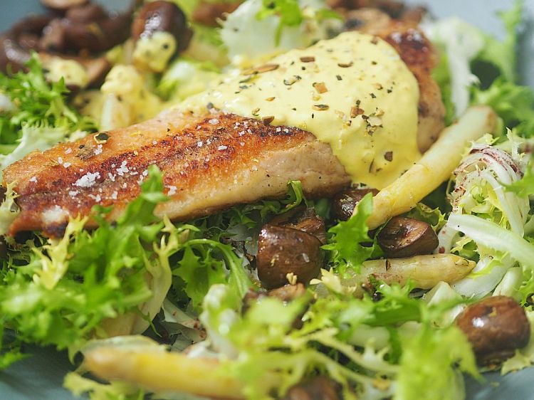 REZEPT Spargel 16 weiße Spargelstangen schälen, den holzigen Teil abschneiden und mit diesen Teilen den Spargelsud zubereiten. In den Dampfgarer geben und den Spargel bißfest garen, ein paar Min. Auf die Seite stellen. Egerlinge 400 g geviertelte braune Egerlinge in der Pfanne ohne Öl scharf anbraten. Wenn die schön braun sind, 2 EL Olivenöl dazu geben. Kurz in der Pfanne mitschwenken. Und dann in ein Sieb gießen, die abtropfende Flüssigkeit von Olivenöl und Bratensaft in einer Schale auffangen. Egerlinge warmstellen. Den bißfest gegarten Spargel in mundgerechte Stücke schneiden. In der heißen Pfanne ohne Öl hineingeben und die Olivenöl-Egerling-Bratensaft-Mischung auf den Spargel gießen. Ein bißchen salzen. In der Pfanne schwenken. Fisch Die Welsfilets knusprig in einer anderen Pfanne anbraten. Senfsoße 3 kleine fein gehackte Schalotten in 2 EL Olivenöl hell anschwitzen. 200 ml Spargelsud aufgießen. 4 TL körnigen Estragonsenf und 150 g Frischkäse hineinrühren auf mittlerer Hitze ein paar Min. köcheln. Dann Kurkuma dazugeben. Mit Salz und Zitrone abschmecken. Topping 3 EL gehackte Kürbiskerne in der Pfanne anrösten. In eine Schüssel geben. mit dem Abrieb einer Amalfizitrone, Meersalz und Lieblingspfeffermischung der Hofköchin mischen. Anrichten die Krause Endivie auf den Teller drapieren. Dann die Spargelstücke, die Egerlinge darauf platzieren, das Fischfilet darauf legen und die warme Senfsoße begießen. Mit dem Topping bestreuen.