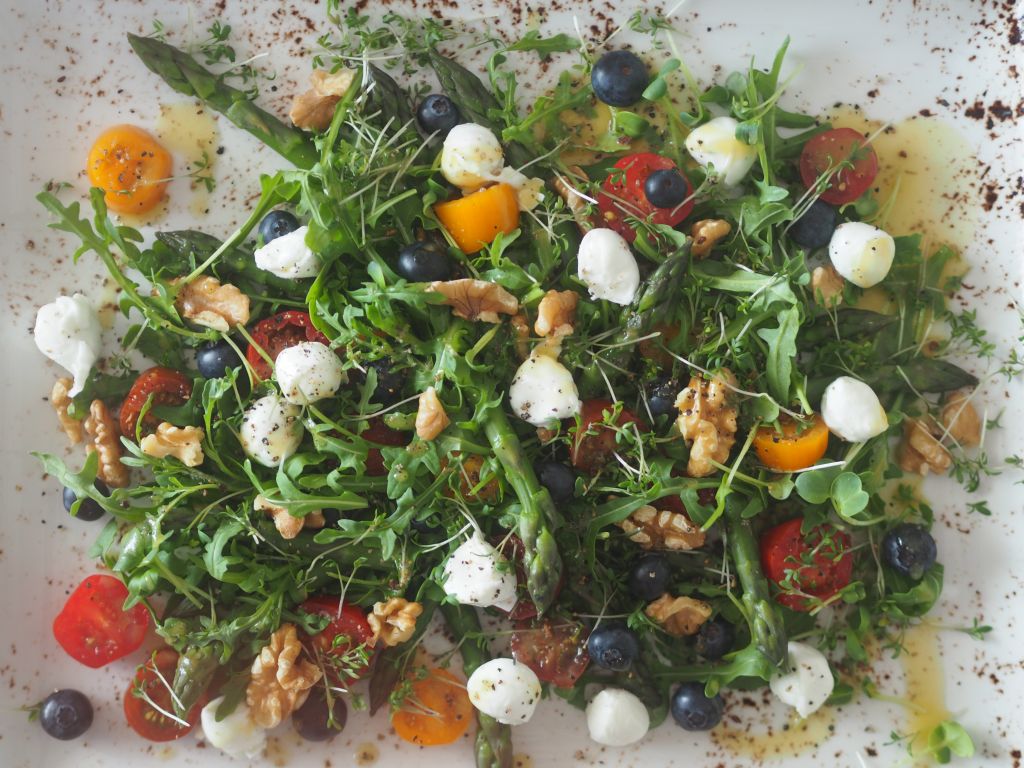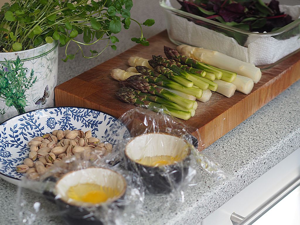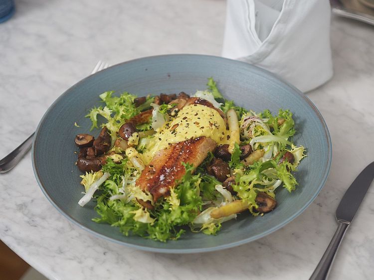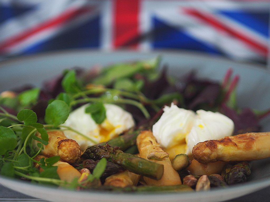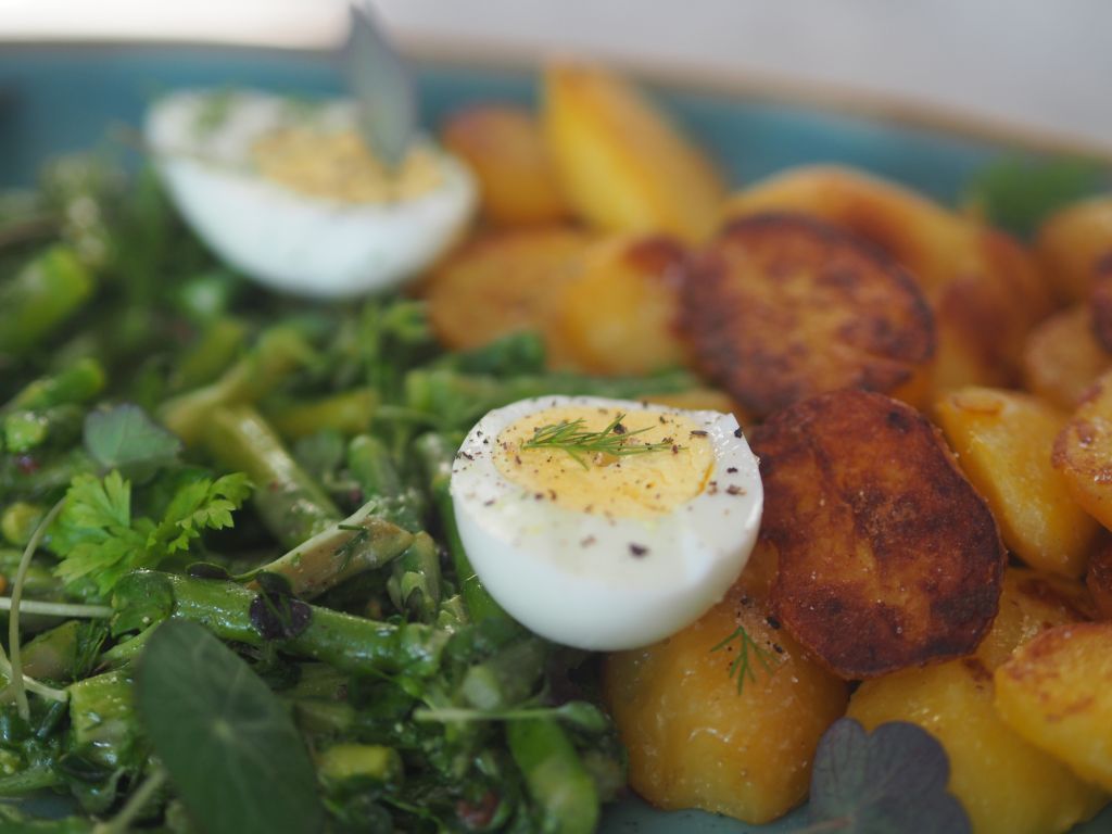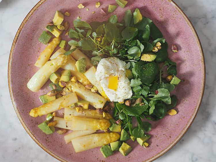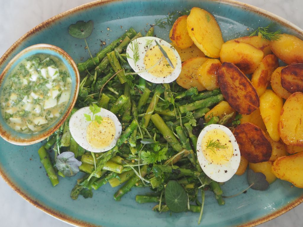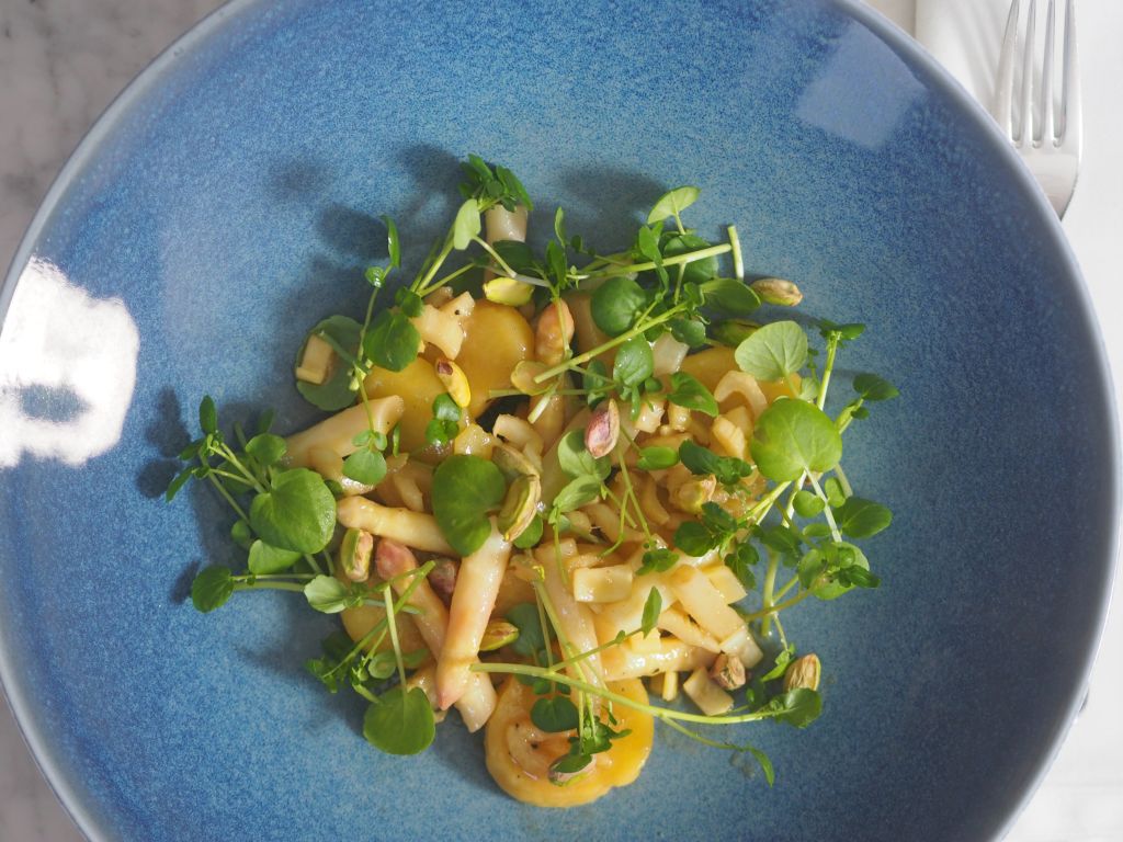 REZEPT Spargel 16 weiße Spargelstangen schälen, den holzigen Teil abschneiden und mit diesen Teilen den Spargelsud zubereiten. In den Dampfgarer geben und den Spargel bißfest garen, ein paar Min. Auf die Seite stellen. Egerlinge 400 g geviertelte braune Egerlinge in der Pfanne ohne Öl scharf anbraten. Wenn die schön braun sind, 2 EL Olivenöl dazu geben. Kurz in der Pfanne mitschwenken. Und dann in ein Sieb gießen, die abtropfende Flüssigkeit von Olivenöl und Bratensaft in einer Schale auffangen. Egerlinge warmstellen. Den bißfest gegarten Spargel in mundgerechte Stücke schneiden. In der heißen Pfanne ohne Öl hineingeben und die Olivenöl-Egerling-Bratensaft-Mischung auf den Spargel gießen. Ein bißchen salzen. In der Pfanne schwenken. Fisch Die Welsfilets knusprig in einer anderen Pfanne anbraten. Senfsoße 3 kleine fein gehackte Schalotten in 2 EL Olivenöl hell anschwitzen. 200 ml Spargelsud aufgießen. 4 TL körnigen Estragonsenf und 150 g Frischkäse hineinrühren auf mittlerer Hitze ein paar Min. köcheln. Dann Kurkuma dazugeben. Mit Salz und Zitrone abschmecken. Topping 3 EL gehackte Kürbiskerne in der Pfanne anrösten. In eine Schüssel geben. mit dem Abrieb einer Amalfizitrone, Meersalz und Lieblingspfeffermischung der Hofköchin mischen. Anrichten die Krause Endivie auf den Teller drapieren. Dann die Spargelstücke, die Egerlinge darauf platzieren, das Fischfilet darauf legen und die warme Senfsoße begießen. Mit dem Topping bestreuen.