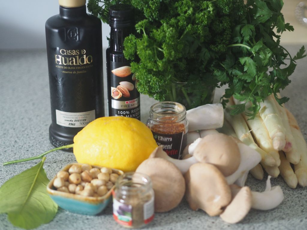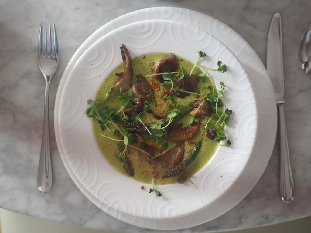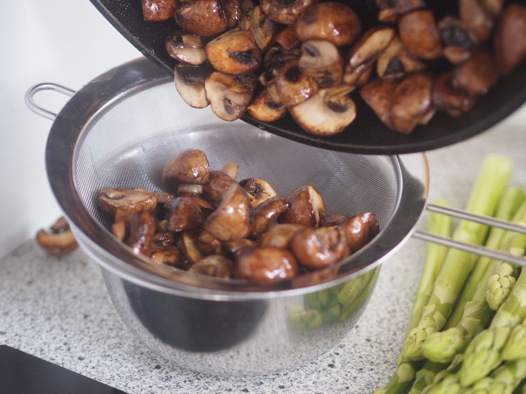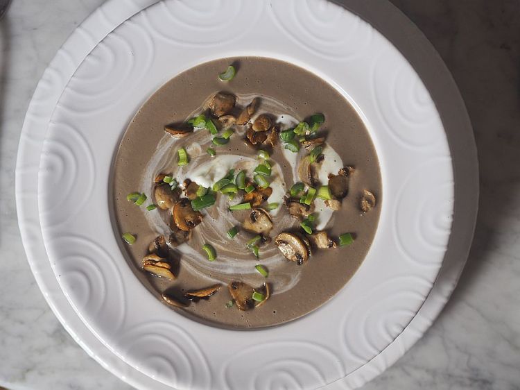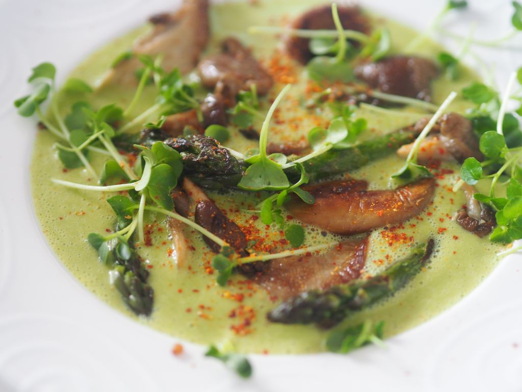 REZEPT 20 g getrocknete Pilze der getrockneten Pilzmischung in heißes Wasser legen. 20 Min. ziehen lassen. In der Zwischenzeit 2 Schalotten und 2 Jungzwiebeln fein hacken und in 2 EL Olivenöl hell anschwitzen. Von 750 g Egerlingen die kleineren auf die Seite stellen. Die restlichen in Scheiben schneiden. Zu den Zwiebeln geben. Herd zurückdrehen und auf mittlerer Hitze ein paar Min. anschwitzen. Die getrockneten Pilze durch ein Sieb gießen und die abgegossene Flüssigkeit auffangen. Die Pilze unter fließendem Wasser abspülen, um vom Staub zu befreien. 4 in Scheiben geschnittene Knoblauchzehen und Sud in einen Topf geben. Mit Wasser und etwas Spargelsud vom Hauptgericht bedecken und eine Viertelstunde auf kleiner Hitze köcheln lassen. Die Suppe in den Standmixer geben und etwa 200 ml Hafermilch dazugießen und fein pürieren. Durch ein Sieb in den Topf seihen. Dann 80 g Frischkäse hineinrühren. Mit Salz und Zitronensaft abschmecken. Die Pilze, die auf die Seite gestellt wurden, in feine Scheiben schneiden und kurz bevor die Suppe fertig ist, in einer Bratpfanne mit einem Hauch Olivenöl und einer Prise Salz knusprig anbraten. Anrichten Etwas Schmand in Zitronensaft und Salz verrühren. Suppe in Teller gießen. Mit den gerösteten Egerlingen reichlich bestreuen. Mit einem Löffel die er Schmand-Zitronenmischung auf der Oberfläche einrühren, damit es eine Spur zieht. Jungzwiebel in Ringe schneiden und bestreuen.