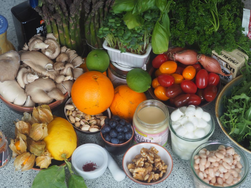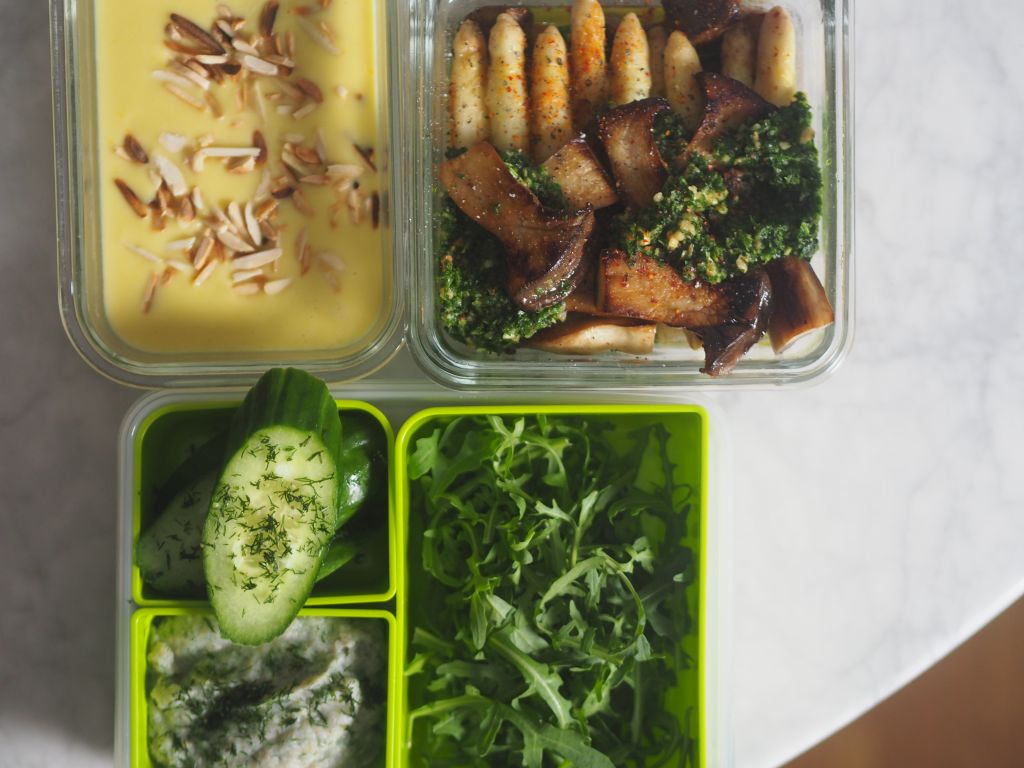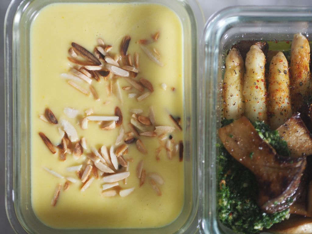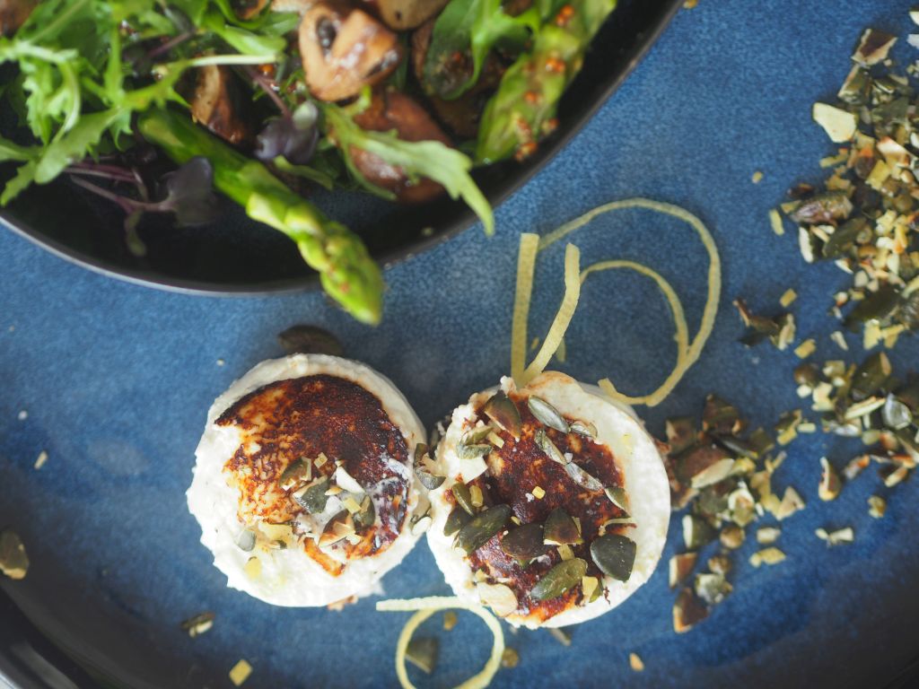 REZEPT 20 g getrocknete Pilze der getrockneten Pilzmischung in heißes Wasser legen. 20 Min. ziehen lassen. In der Zwischenzeit 2 Schalotten und 2 Jungzwiebeln fein hacken und in 2 EL Olivenöl hell anschwitzen. Von 750 g Egerlingen die kleineren auf die Seite stellen. Die restlichen in Scheiben schneiden. Zu den Zwiebeln geben. Herd zurückdrehen und auf mittlerer Hitze ein paar Min. anschwitzen. Die getrockneten Pilze durch ein Sieb gießen und die abgegossene Flüssigkeit auffangen. Die Pilze unter fließendem Wasser abspülen, um vom Staub zu befreien. 4 in Scheiben geschnittene Knoblauchzehen und Sud in einen Topf geben. Mit Wasser und etwas Spargelsud vom Hauptgericht bedecken und eine Viertelstunde auf kleiner Hitze köcheln lassen. Die Suppe in den Standmixer geben und etwa 200 ml Hafermilch dazugießen und fein pürieren. Durch ein Sieb in den Topf seihen. Dann 80 g Frischkäse hineinrühren. Mit Salz und Zitronensaft abschmecken. Die Pilze, die auf die Seite gestellt wurden, in feine Scheiben schneiden und kurz bevor die Suppe fertig ist, in einer Bratpfanne mit einem Hauch Olivenöl und einer Prise Salz knusprig anbraten. Anrichten Etwas Schmand in Zitronensaft und Salz verrühren. Suppe in Teller gießen. Mit den gerösteten Egerlingen reichlich bestreuen. Mit einem Löffel die er Schmand-Zitronenmischung auf der Oberfläche einrühren, damit es eine Spur zieht. Jungzwiebel in Ringe schneiden und bestreuen.